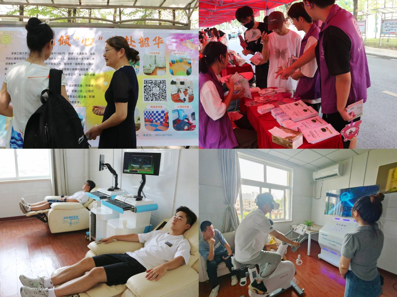 设置心理宣传展板,强化心理健康服务。心理健康教育中心精心设计制作心理宣传展板,详细介绍我校心理健康教育中心概况,中心内设的宣泄解压室、音乐放松室、沙盘活动室、心理测量室等特色心理功能体验室,成功吸引了众多学生和家长的目光,在工作人员的带领下,新生们来到心理健康教育中心“沉浸式”地体验了各项设施。迎新现场还设置了现场咨询点,提供心理咨询预约服务指导,让新生和家长在入学第一天就能获取和知晓心理健康自助互助的快速通道。