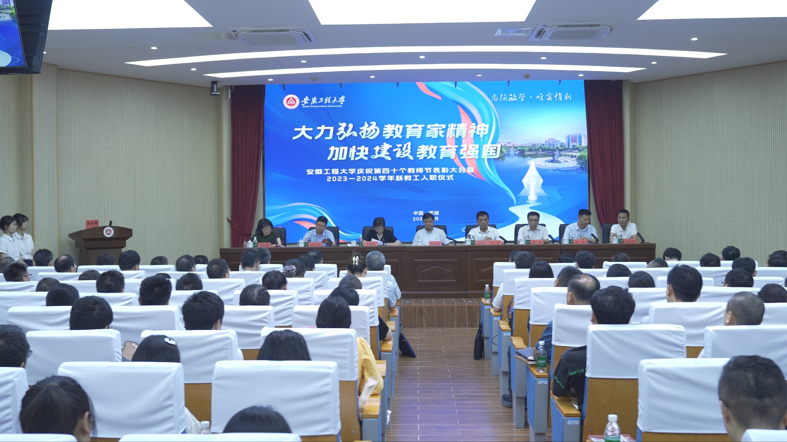 本网讯为热烈庆祝第40个教师节,大力弘扬尊师重教良好风尚,9月9日,学校在A座104会议室举行庆祝第40个教师节表彰大会暨新教工入职仪式。校领导张志宏、卢平、苏国红、郑健、程双四、凤权、周虹屏、高彦峰出席活动,相关职能部门、各二级学院主要负责人,受表彰教职工及全体新进教职工参加仪式。