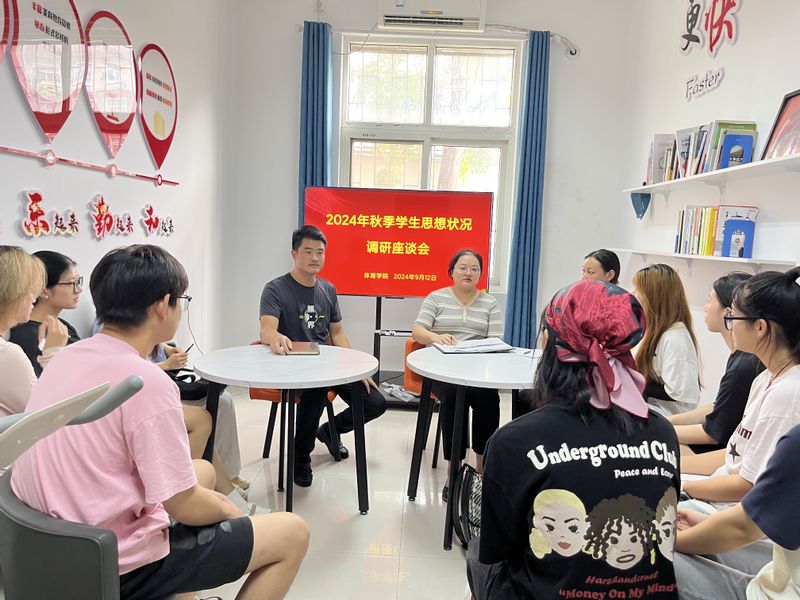本网讯为深入了解新学期学生思想动态、心理状况及合理诉求,9月13日,体育学院在女生宿舍六栋102社区文化站举行秋季学期学生思想动态调研座谈会。学院党总支副书记马晓琼、团委书记范同军、各班级学生代表参加了会议,会议由马晓琼主持。