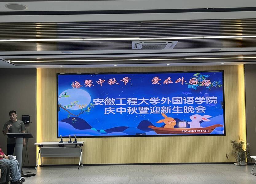 本网讯9月13日,外国语学院隆重举办研究生新生导师见面会、新生老生见面会以及 “缘聚中秋节,爱在外国语”迎新晚会。会议由研究生秘书杨会勇主持,全体研究生和研究生导师参加。