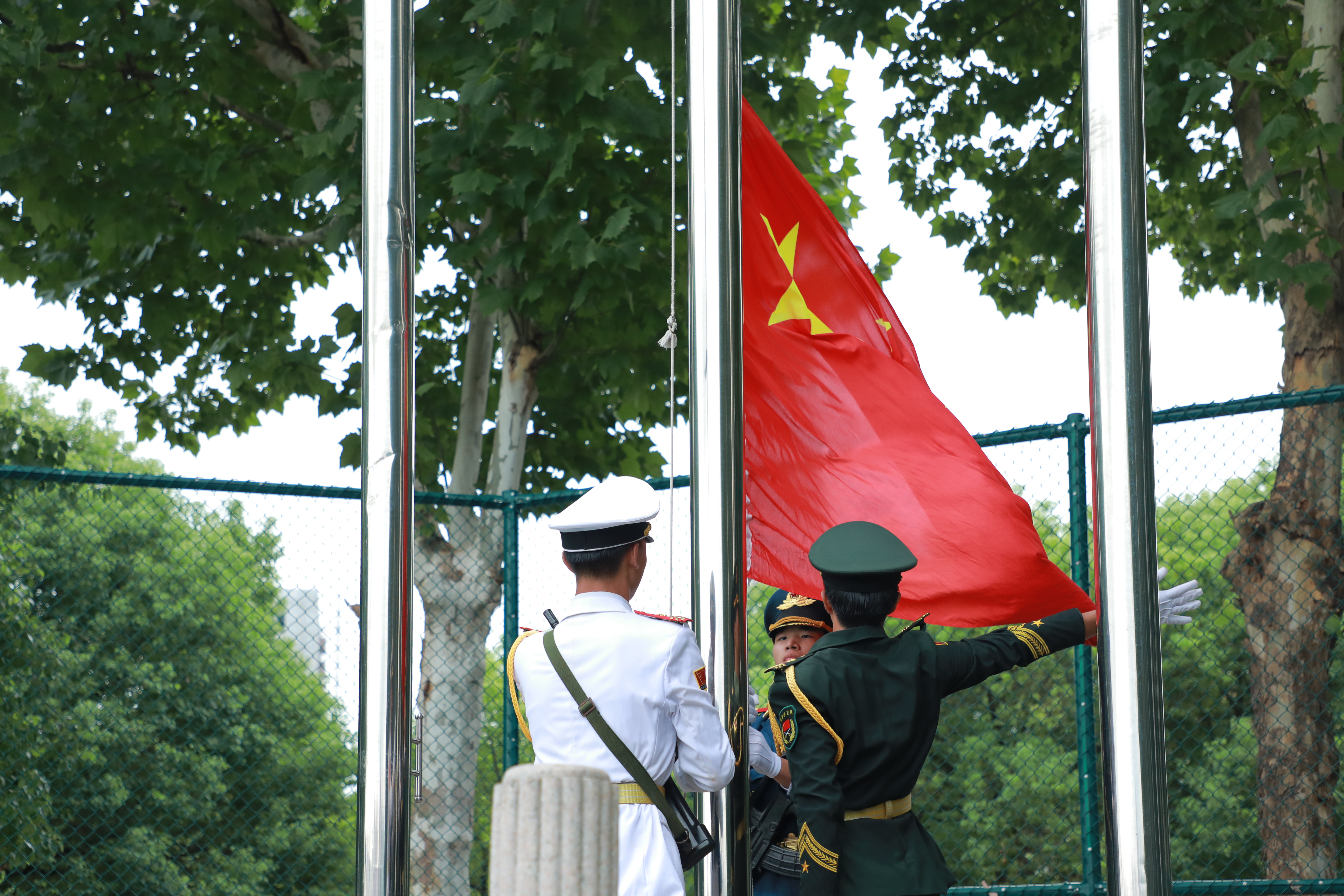 伴随着庄严的国歌,五星红旗在国旗班的护卫下冉冉升起,开学典礼在全体师生严肃的国歌声中正式拉开帷幕。