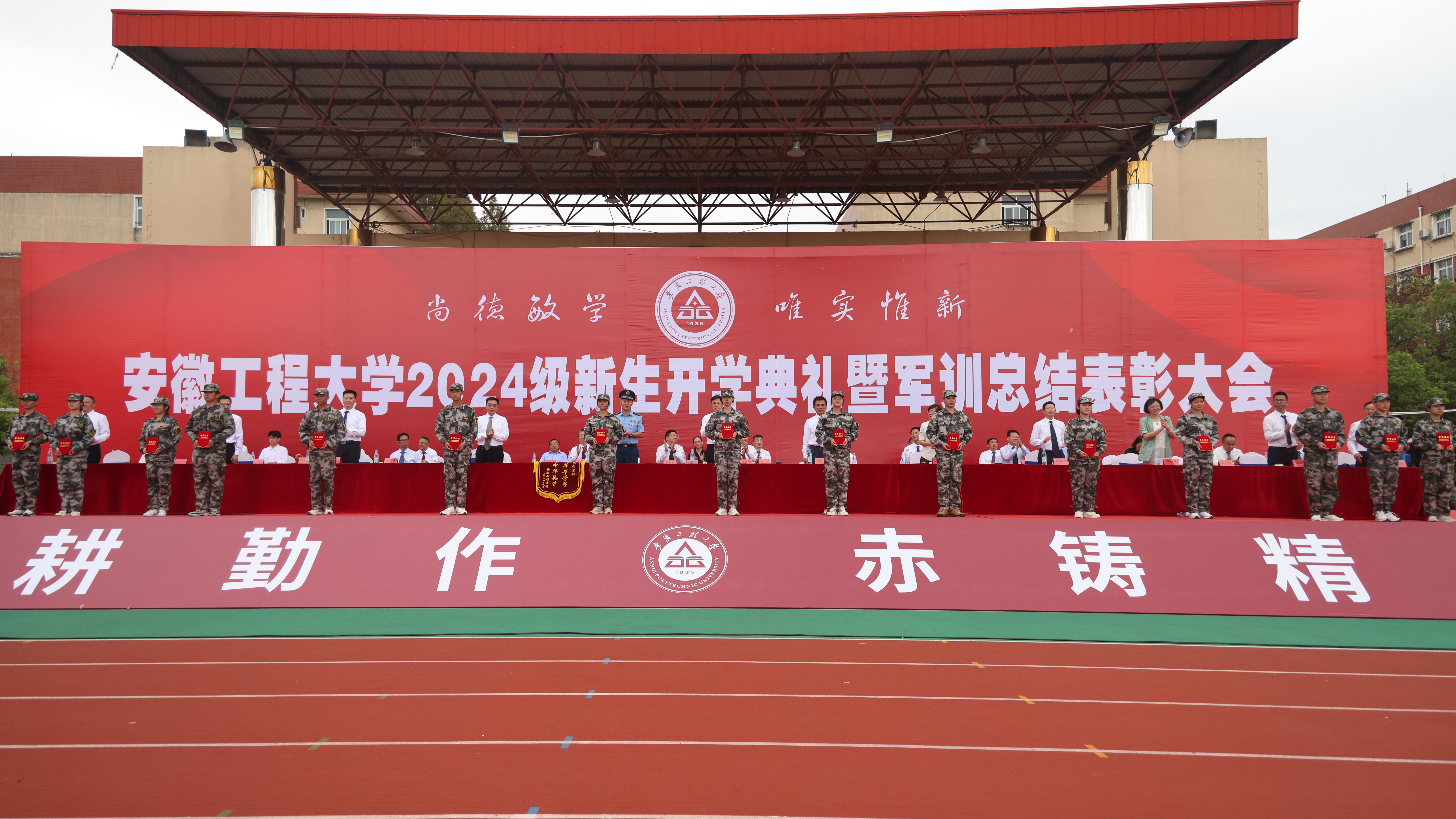 校党委书记张志宏代表学校向军训指导单位鸠江区人武部赠送锦旗。校党委副书记苏国红宣读2024新生军训先进集体和先进个人的表彰决定,主席台前排领导和嘉宾为军训先进连、军训先进个人代表颁奖。