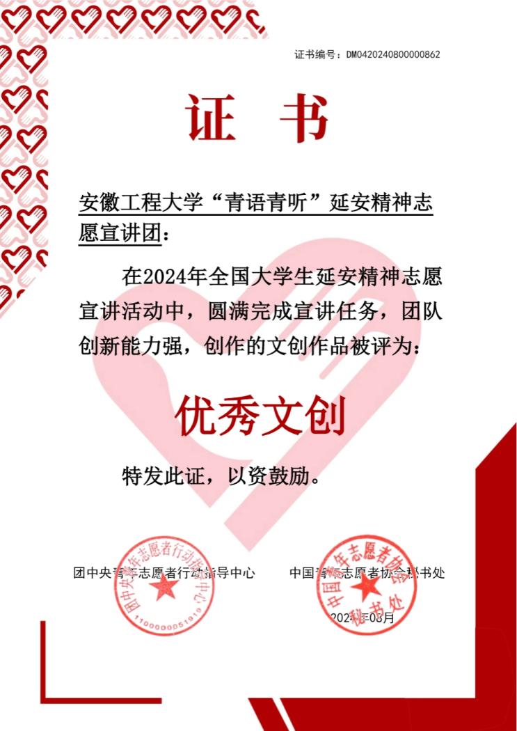 本网讯 近日,我校“青语青听”延安精神志愿宣讲团在2024年全国大学生“延安精神”志愿宣讲团活动中所设计的文创产品被评为“优秀文创”。