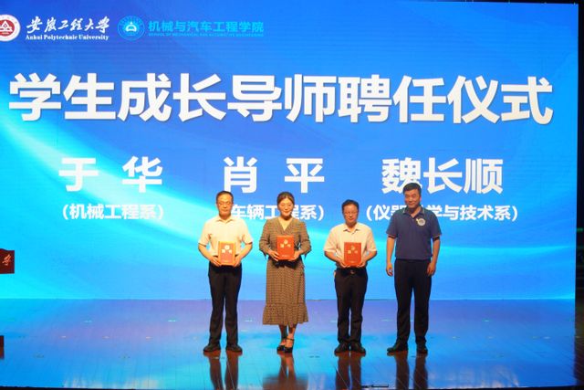 典礼特别安排了向榜样学习颁奖仪式和成长导师聘任仪式,学院党委副书记秦广虎、副院长王建彬为获得2023年国家奖学金、2024年参加第十八届CIMC“西门子杯”中国智能制造挑战赛并获得特等奖的同学颁奖,学院大创中心主任钟相强为获得2024中国汽车工程学会巴哈大赛二等奖的“雷电车队”、2024第十一届全国大学生机械创新设计大赛二等奖的学生颁发荣誉证书。王建平为于华、肖平、魏长顺三位教师颁发了学生成长导师聘书,旨在表彰先进、发挥优秀学生的示范引领作用,同时让新同学有了主心骨,告诉同学们遇到问题可以找成长导师求教。典礼上还介绍了学院培养的安徽省十佳百优大学生、安徽省研究生党员标兵、安徽省最美大学生、全国优秀共青团员、全国大学生年度人物入围奖获得者、中国大学生自强之星等优秀学生事迹。