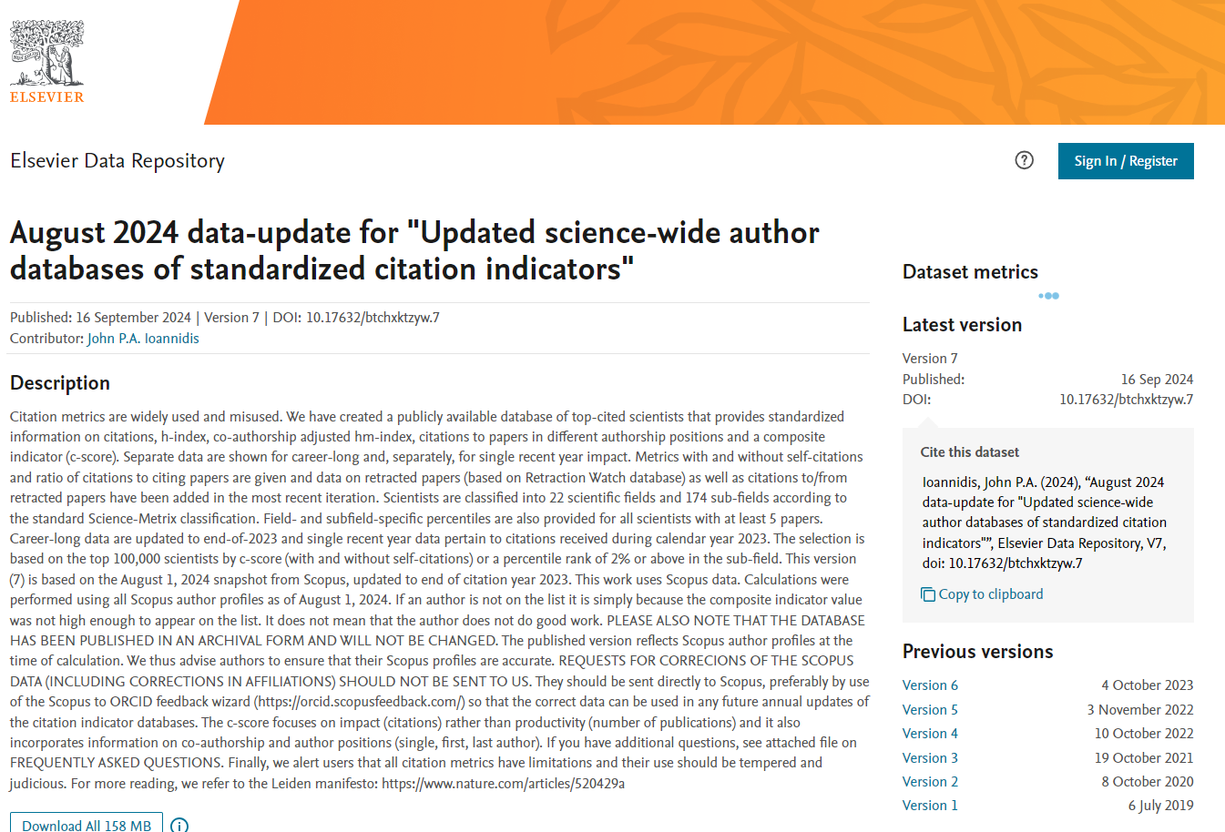 “全球前2%顶尖科学家榜单”在学术界被视为衡量科学家长期科研表现和学术影响力的一个客观指标。榜单分为“终身科学影响力榜单”和“年度科学影响力榜单”,分别关注科学家整个学术生涯迄今的影响力和本年度的学术成就。该榜单基于Scopus数据库详尽的引用数据分析,通过综合考虑被引次数(区分自引与他引)、H指数、HM因子等六项指标,全面评估了近700万科学家的学术贡献,覆盖22个主要学科领域及176个子领域,旨在表彰那些在职业生涯中或本年度内展现出卓越科学影响力的学者。