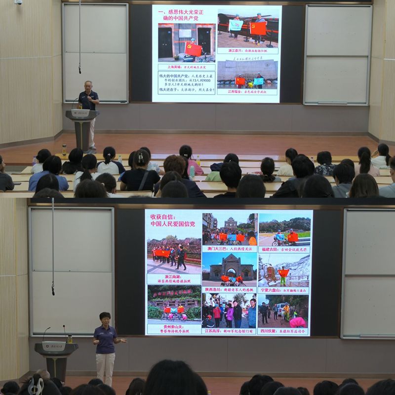 党史树“正”,红色骑行启蒙党性。学院邀请“中国当代徐霞客”暨全国红色旅游特别奖获得者、学校退休党员教师赵国庆、曹锦芬夫妻为新生开展入党启蒙教育。教导同学不忘“四感恩”--感恩伟大光荣正确的中国共产党、感恩伟大领袖和仁人志士、感恩所有爱国军队、感恩革命先烈,激励新生积极向党组织靠拢,时刻铭记历史、赓续红色血脉、传承红色基因,坚持在历史的洪流之中勇立潮头、砥砺前行。