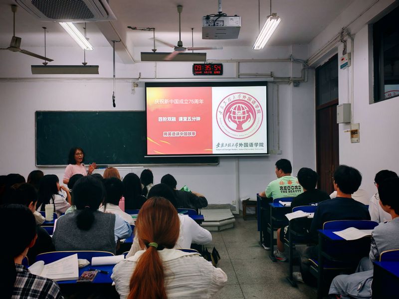 “课堂五分钟”“用外语讲中国故事”利用上课后的五分钟,教师主导、学生主体,在外语课堂里共同打造了一个个思政“微课堂”,这是外语课程思政教学的创新实践,也是学院“三全育人”的生动体现。大学英语“双带头人”王钰博士在本期活动结束后说到“落实立德树人根本任务,高校老师要弘扬教育家精神,既做‘经师’,也做‘人师’,这一点在外语教师身上尤为重要。本次活动给师生带来了很好的课堂教与学的体验。能以这样的形式与学生一起庆祝国庆,我感到很有意义。”