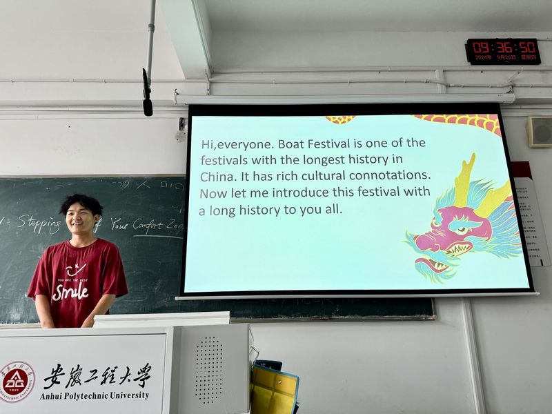 “开学第一课”,新生登台演讲初体验,英语口述传统文化精彩纷呈。新同学们跃跃欲试,小组间分工明确,合作收集素材,制作ppt,现场汇报气氛热烈。从古代先贤孔子所倡导的儒家思想,到中国茶文化的历史传承,再到都江堰等古代水利工程奇迹等。这些历史人物、文化习俗、现代成就,都在他们的讲述中焕发出新的光彩。区块链241班的刘德恩同学说:“第一次上这样的英语课,与高中完全不一样。第一次课就站到讲台上进行展示,我感到很新奇,也很幸运。通过用英语讲述中国故事,我们不仅锻炼了自己的口语表达能力,还加深了对中国文化的理解和认同。这样的活动对我们的成长非常有帮助。