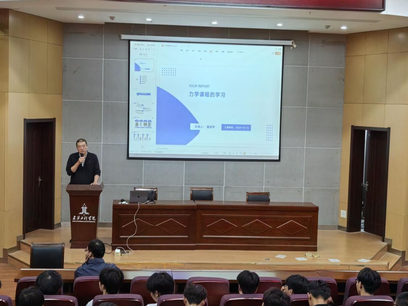 姜忠宇从日常生活中的力学现象出发,阐述了学习力学课程的重要性,指出了力学学习的难点所在,并就如何高效学习力学以及考试和评估方法等问题进行了详细讲解。通过回顾力学的发展历程和经典有趣的力学案例,姜忠宇激励同学们从事创新性研究,提出新的力学模型或探索解决方案,强调“知之者不如好之者,好之者不如乐之者”,提倡通过阅读相关书籍、观看科普视频等多种途径来培养对力学的兴趣,激发好奇心。同时,他强调学习力学应注重理解而非机械记忆,应通过公式推导和案例研究来深化对概念的理解,希望通过本次学习能够使同学们对力学知识有更深刻的把握,激发对专业知识学习的热情。廖斌强调力学课程的学习需要建立扎实的基础,建议同学们精读教材,对基本概念、定理和公式做到透彻理解,这是攻克力学难题的首要前提。同时,廖斌鼓励学生们积极参与课堂互动。他认为,课堂上老师和同学的思想碰撞,能够激发学生对力学问题的深入思考,有助于开拓解题思路,并强调了实验的重要性,要将理论知识与实际应用紧密结合,从而更深刻地领悟力学原理。