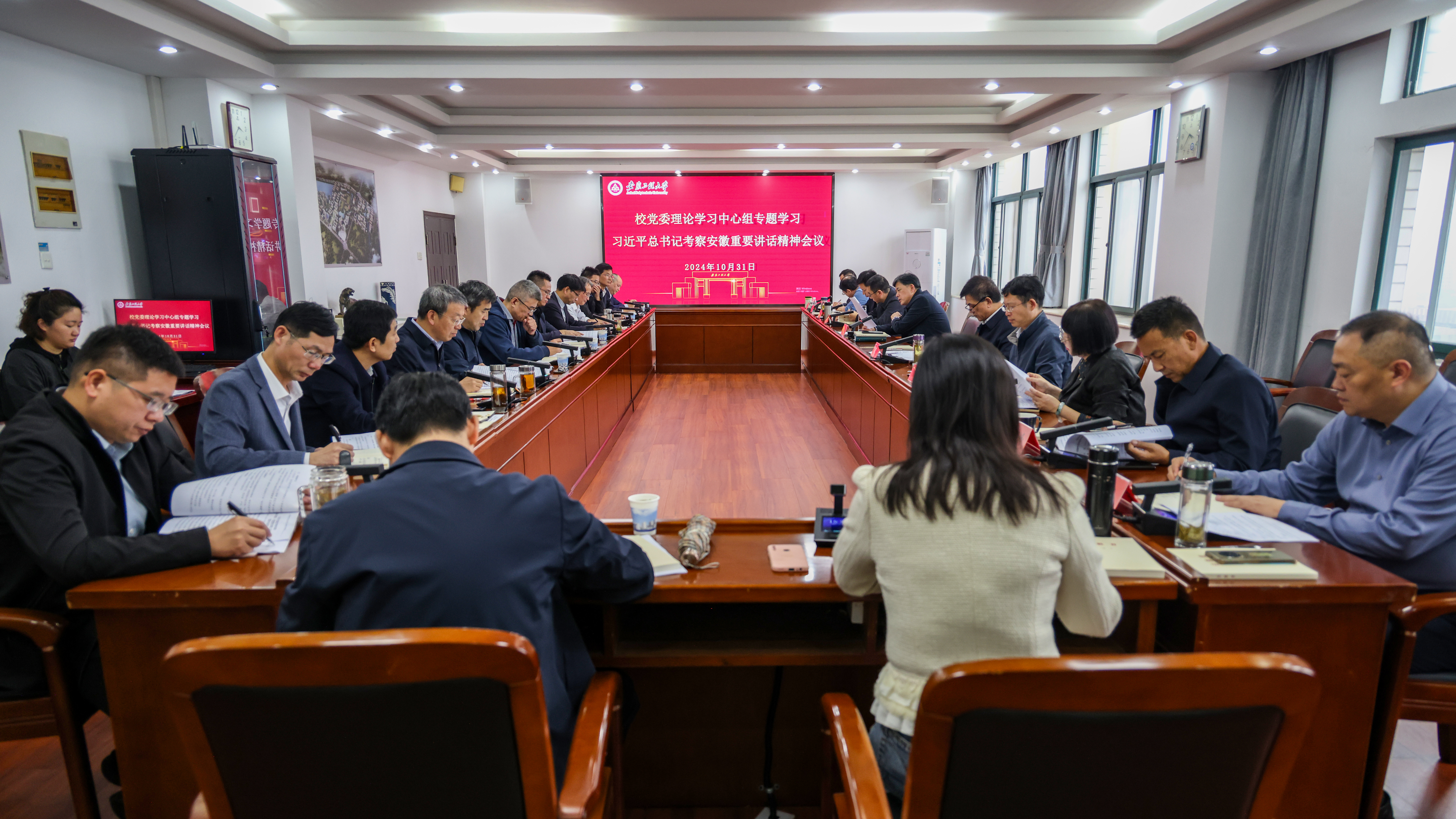 本网讯10月31日,校党委理论学习中心组在A座1215会议室召开会议,专题传达学习习近平总书记考察安徽重要讲话精神以及省委相关会议精神。校领导,校党委理论学习中心组成员参加会议。会议采取“双随机”方式,随机抽点科技处、生物与食品工程学院、经济与管理学院、马克思主义学院党员干部列席会议。校党委书记张志宏主持会议。
