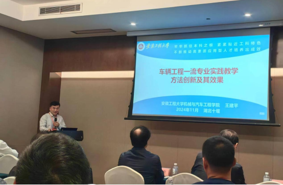 王建平围绕《车辆工程一流专业实践教学方法创新及其效果》分别从车辆工程专业实习实训方式探索、实践教学创新思路与方法,特别是车辆工程专业建设过程中摸索出来的一些典型经验做法,如改源头(培养方案大修)、朋友圈(校-政-企联盟)、建师资(双师双能型教师团队)、建基地(优质实习实训基地)、挖内潜(优化实验项目)、深融合(校-企协同)等逐一向与会者进行了展示,并介绍了车辆工程专业近年来在学科竞赛、招生就业、升学和创业等方面取得的一些显著成效,以及教师们通过教学相长所获得的丰硕教学科研成果和个人荣誉,创新思路和做法得到了大家的高度评价。