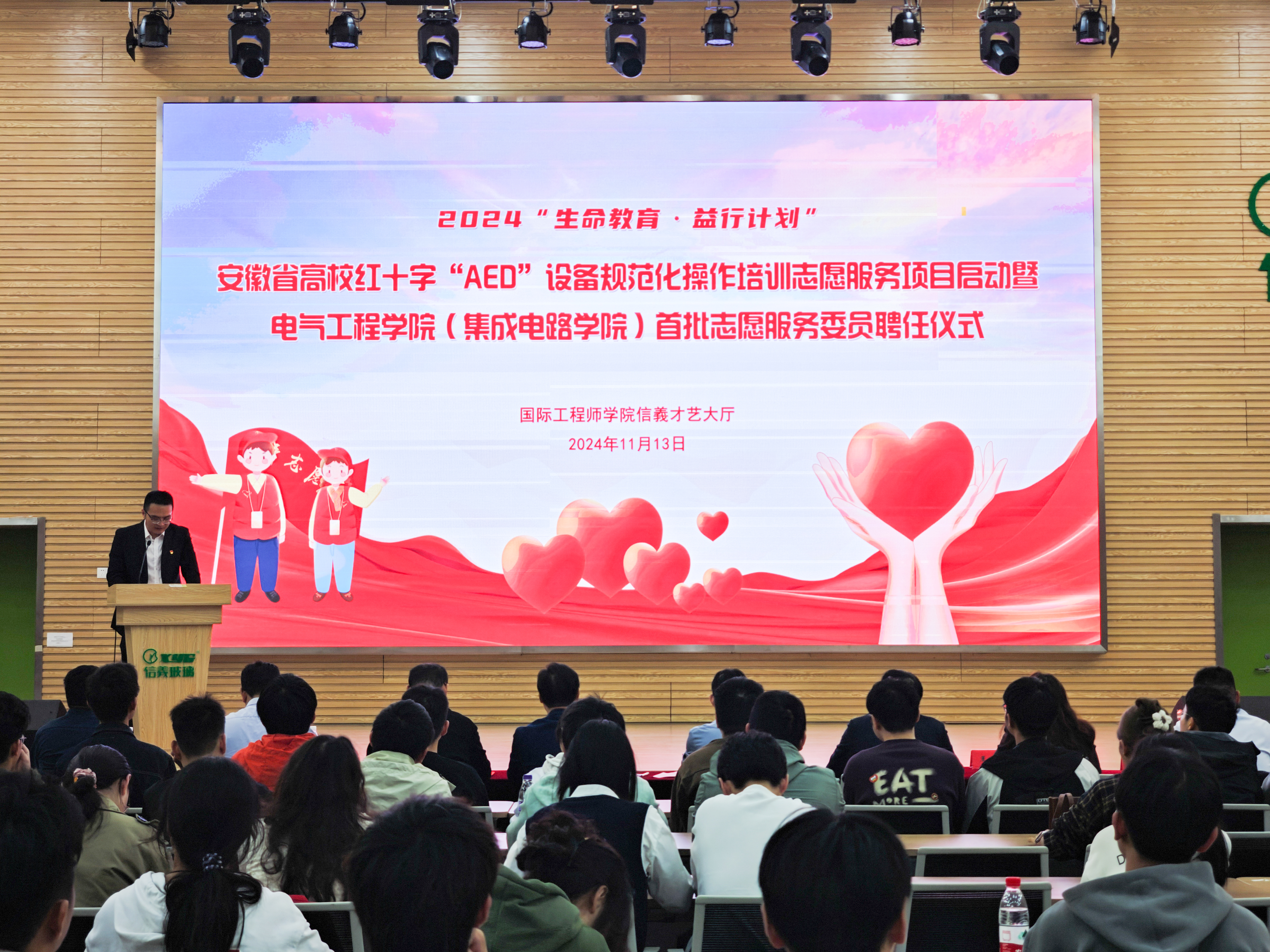 本网讯为进一步提高全体师生的应急救护能力,强化师生志愿服务意识,充分发挥新一届团学组织和学院“一站式”学生社区服务功能,11月13日,电气工程学院(集成电路学院)在国际工程师学院校区信义才艺大厅启动2024“生命教育·益行计划”安徽省高校红十字“AED”设备规范化操作培训志愿服务项目暨学院首批志愿服务委员聘任仪式。学院党委书记杨会成、国际工程师学院和谐学生社区党委书记郭全根、皖南医学院第二附属医院纪委书记吴金庭、校团委兼职副书记姚伟波、芜湖市运达轨道交通建设运营有限公司团委副书记夏孟以及相关负责人和200余名师生代表出席活动。仪式由安徽省高校红十字“AED”志愿项目负责人阳岚主持。