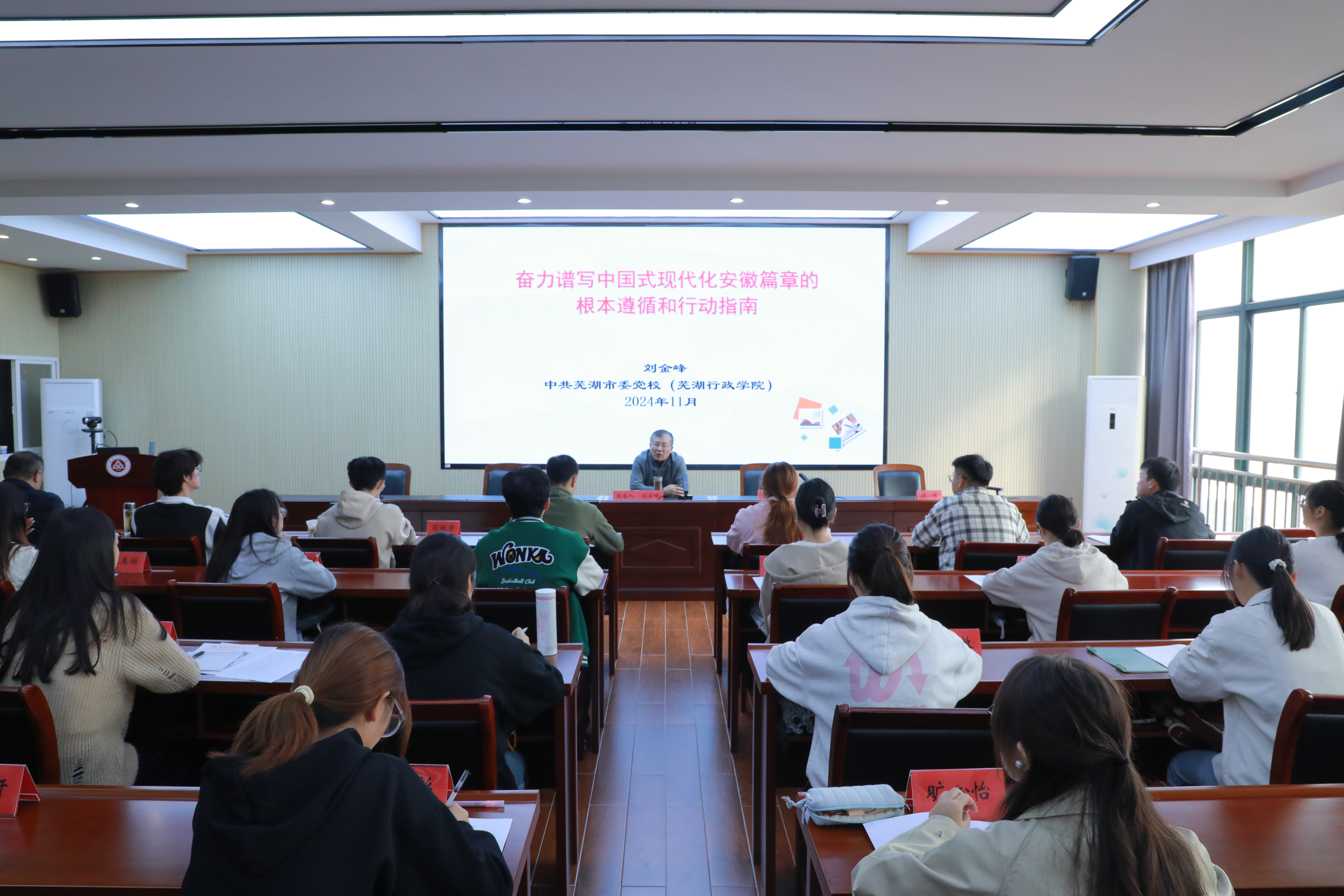 开班仪式后,芜湖市委党校副教育长、三级调研员,省委讲师团全省基层宣讲专家刘金峰老师讲授题为《奋力谱写中国式现代化安徽篇章的根本遵循和行动指南》的党课。他从深刻理解习近平总书记考察安徽重要讲话蕴含的核心要义、认真领会习近平总书记考察安徽重要讲话提出的任务要求、全面把握习近平总书记考察安徽重要讲话贯穿的观点方法、切实推动习近平总书记考察安徽重要讲话在芜湖落地生根等四个方面,深刻阐释和解读了习近平总书记考察安徽重要讲话精神。