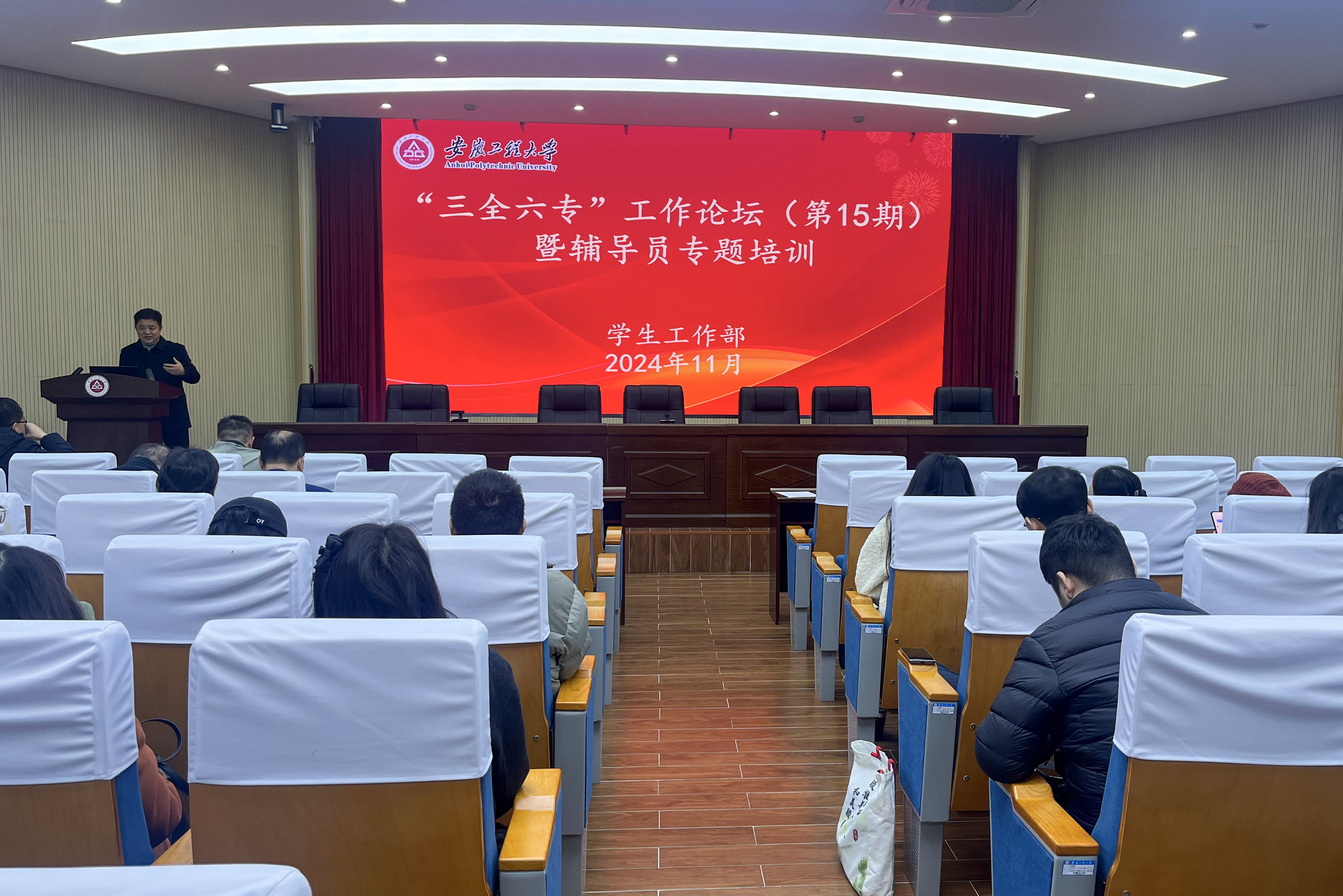 本网讯11月27日,学校在A座104会议室举行“三全六专”工作论坛(第15期)暨辅导员专题培训会。校党委常委、副校长张开炳,各学院党委副书记、全体辅导员、校医院和学工部工作人员参加了活动。活动由学工部部长黄炜主持。