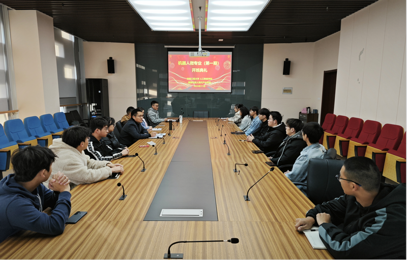 刘玉飞对各位同学顺利加入机器人微专业表示祝贺。他介绍了机器人微专业的开设背景、培养目标和培养模式以及人工智能学院在微专业建设、实践教学资源等方面的优势资源。他表示,学校开设机器人微专业旨在培养多学科知识交叉融合的机器人复合型人才,是探索人才培养模式改革的重要举措,他希望同学们珍惜微专业的学习机会,坚持不懈,认真实践,主动将机器人专业知识与主修专业有机融合,能够在微专业学有所获。