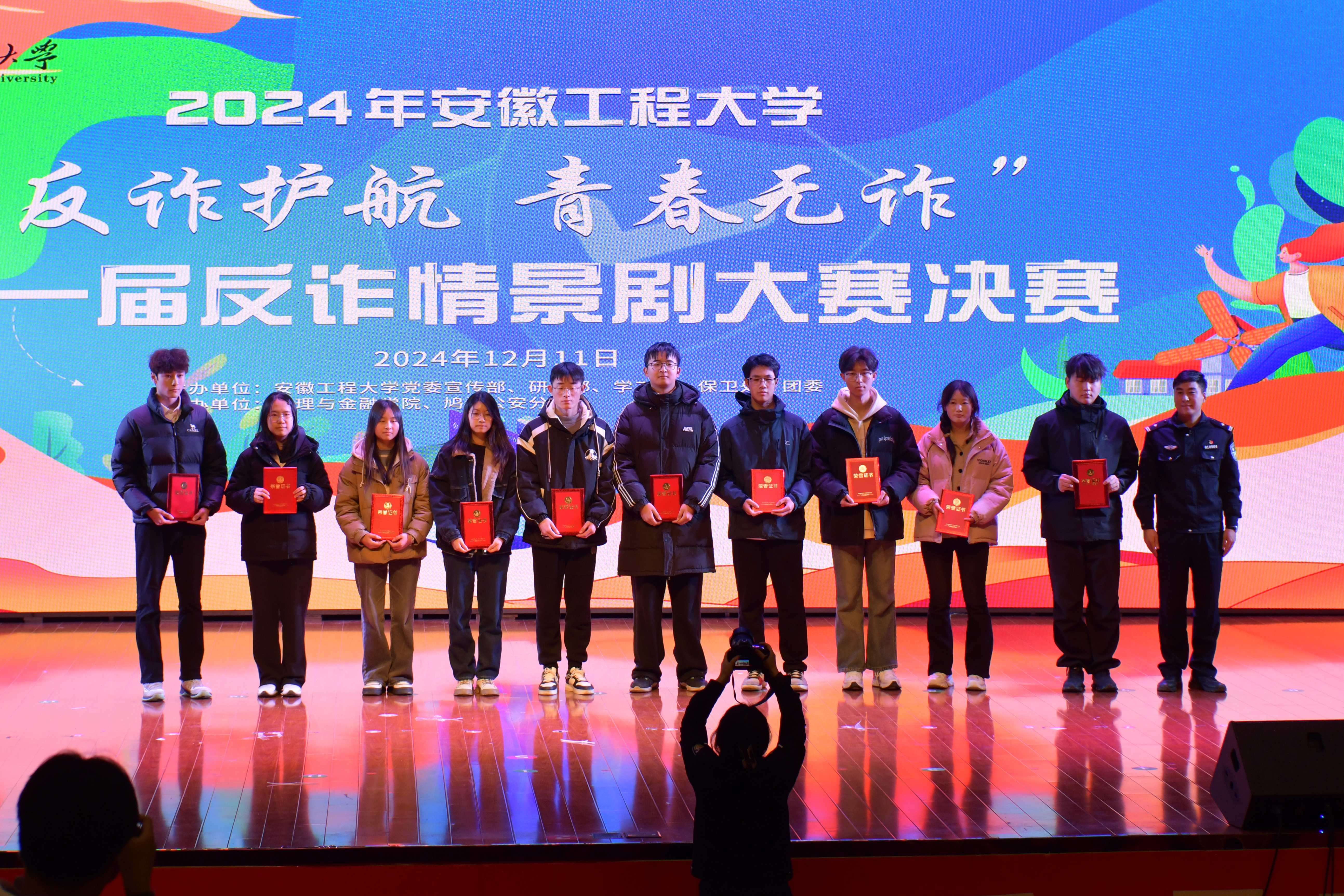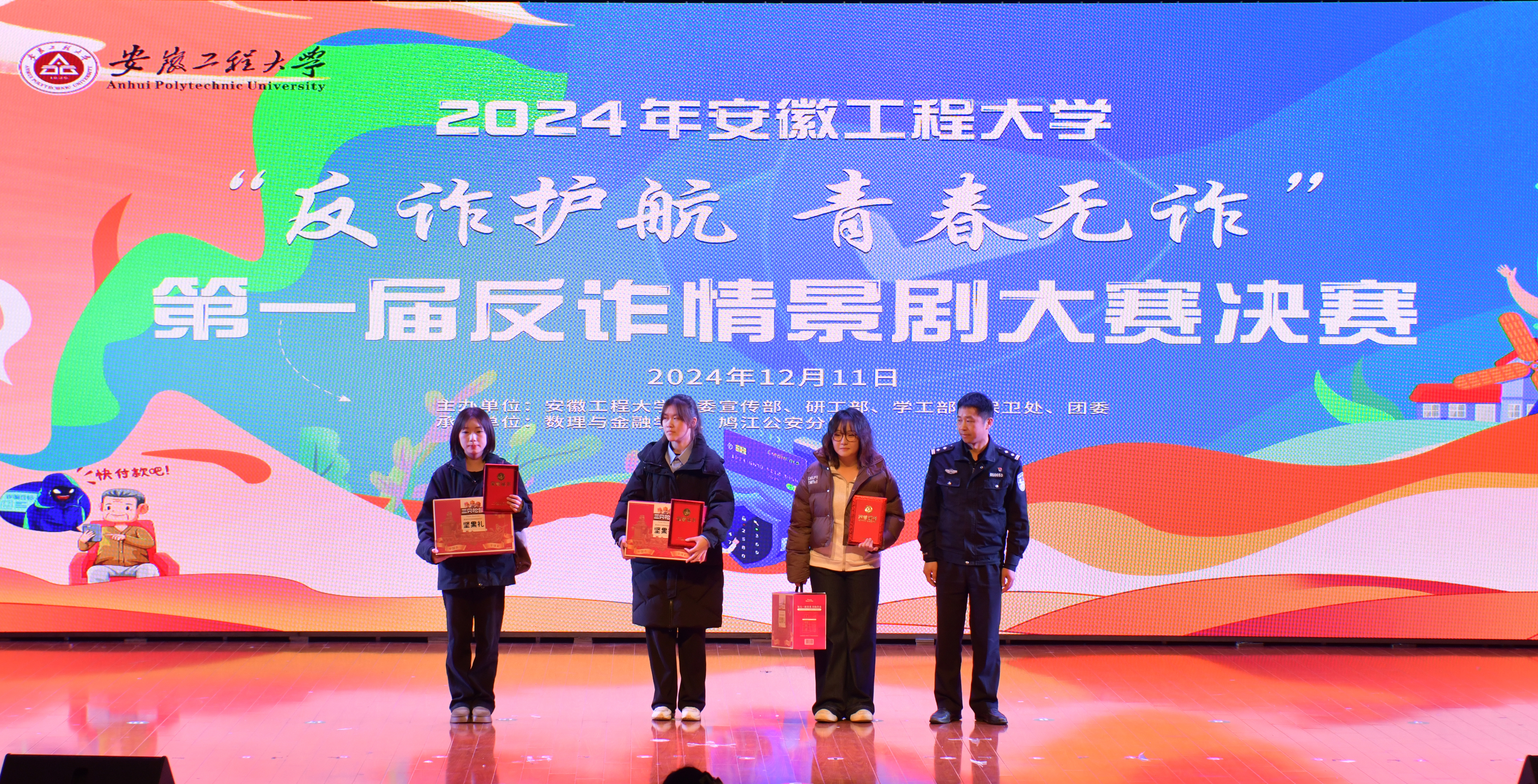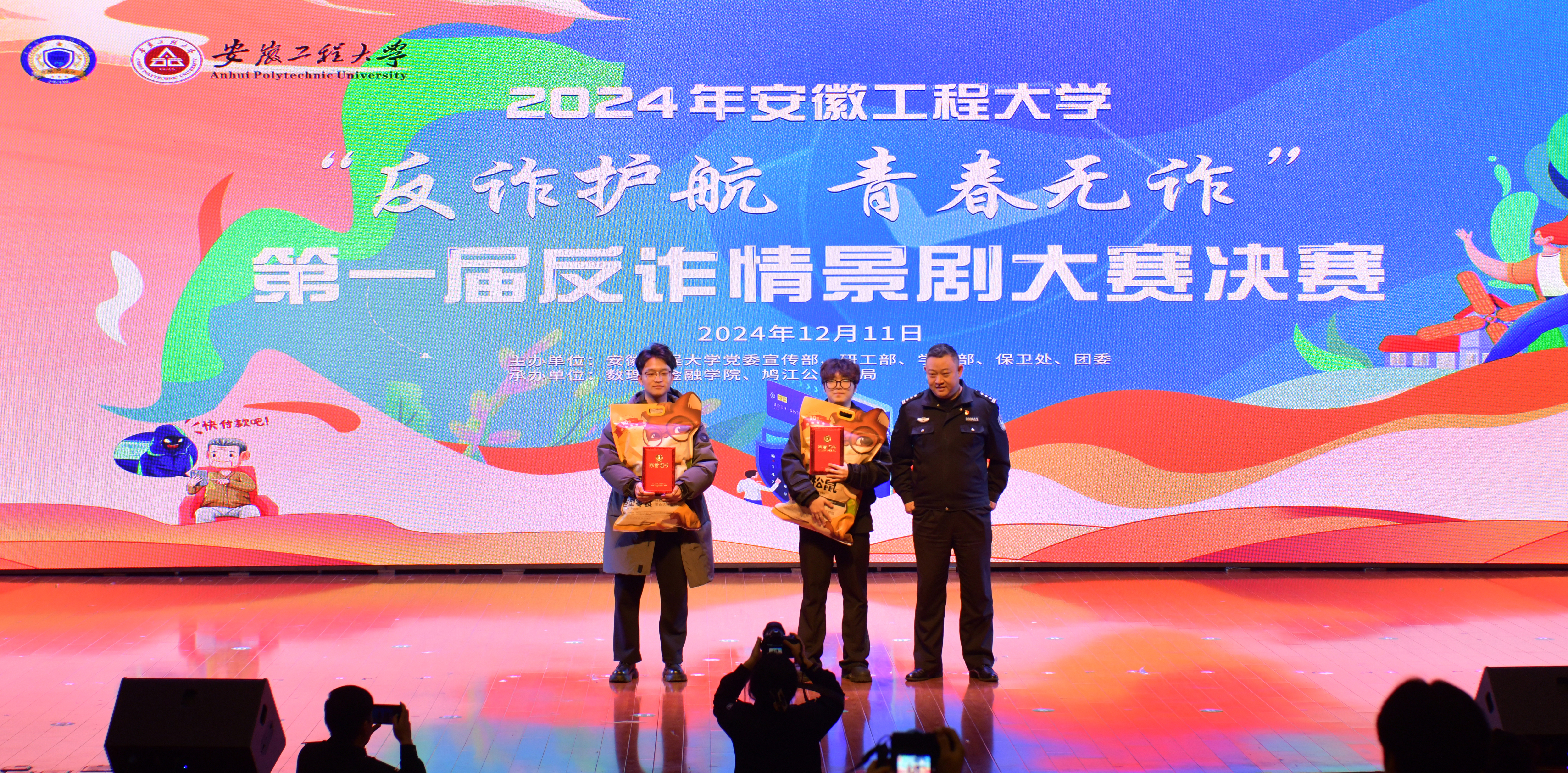 本网讯12月11日,学校第一届反诈情景剧大赛决赛在师生活动中心大礼堂举办。经激烈角逐,《说谎的蚂蚱》《反诈联盟》斩获一等奖,《爱的伪装》《今天你被骗了吗》《茧房》荣获二等奖,《男朋友?女朋友?》《骗骗相报》《善恶的彼端》《快门下的陷阱》《一惊一诈》获得三等奖,其中《爱的伪装》和《反诈联盟》获得最佳人气奖,机械与汽车工程学院和数理与金融学院获得优秀组织奖。校党委常委、副校长张开炳出席并讲话,芜湖市公安局鸠江公安分局党委委员、副局长佘辉,城东新区派出所所长陶红云,学校党委宣传部、学工部、研究生工作部、保卫处、团委、数理与金融学院等部门负责人,全校1000余名师生在现场观看比赛。鸠江公安分局反诈中心民警和学校师生代表担任大赛评委。