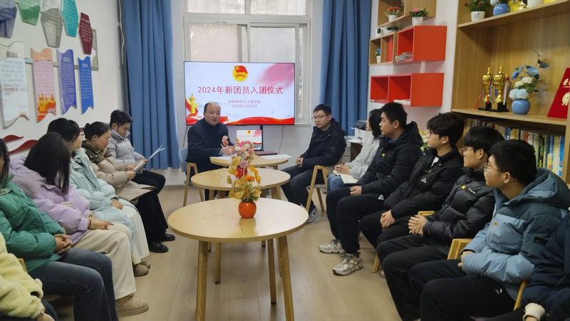 本网讯为学习贯彻落实习近平总书记关于青年工作的重要思想,加强新团员思想政治教育,进一步增强新团员对团组织的归属感,树立新团员的主人翁意识,推深做实“三全六专”育人实践,12月18日,材料科学与工程学院在宿舍青年议事中心举办2024年度新团员入团仪式。学院党委副书记方玖胜、团委教师兼职副书记鲁力、辅导员周冬梅、学院团委组织部负责人及2024年新团员共同参加仪式。仪式由院团委书记田园主持。
