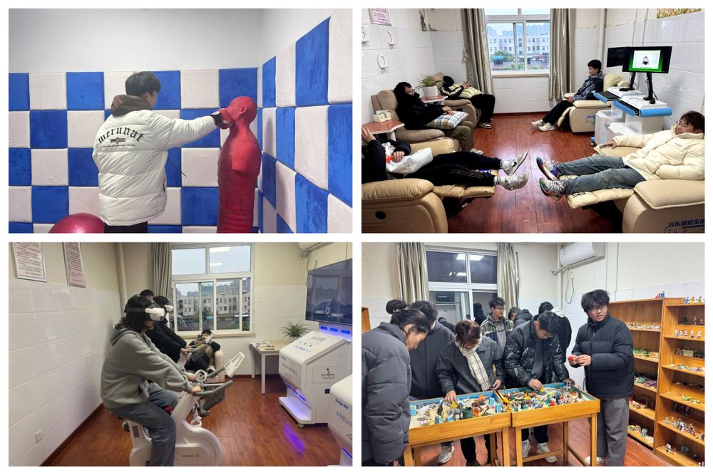 大一新生们面临的学业压力和人际交往等问题,亟需情绪的宣泄口,各个功能室为他们提供了情感的栖息地。在宣泄室,同学们挥舞着拳套,尽情发泄着心中的情绪,无论是积极的欢笑还是愤怒的咆哮,都是心灵的自然流露,都可以被接纳和理解。在音乐放松室,通过音乐的疗愈作用,帮助同学们逐渐走出情绪的阴霾,重建积极的心态提供了一片宁静的心灵栖息之所。在运动解压室,通过VR眼镜,经历奇幻的旅行,获得身心的松弛与宁静。在沙盘室,同学们倾听内心深处的声音,让心灵在沙与物的交融中,找到属于自己的答案,踏上那充满阳光与希望的心灵之路。
