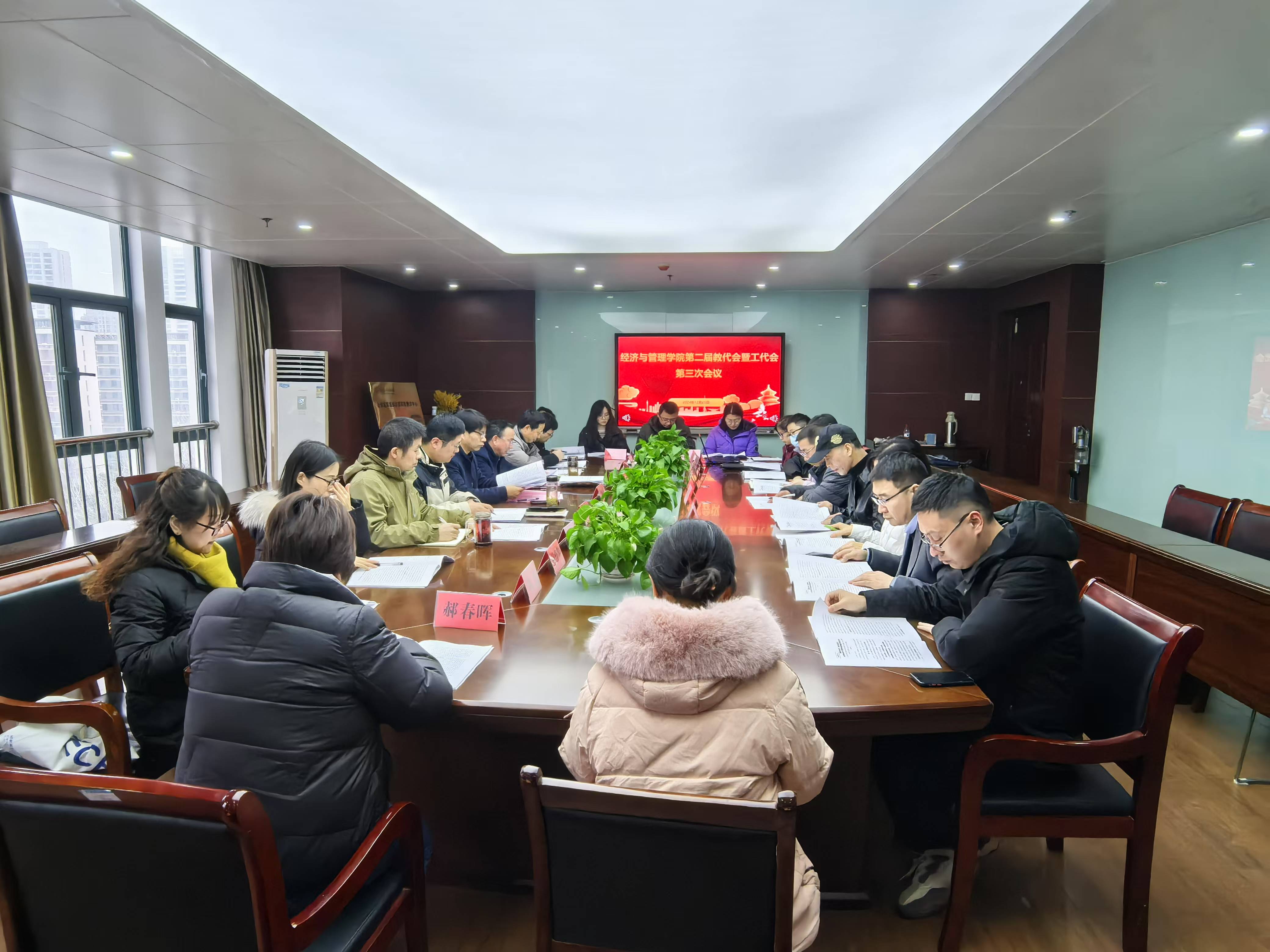 本网讯12月25日,经济与管理学院在学院818会议室召开第二届教职工代表大会暨工会会员代表大会第三次会议,学院教代会、工代会全体代表和列席代表参加会议。