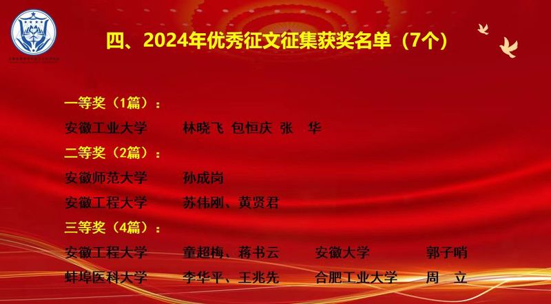 本网讯12月27日,安徽省高等学校保卫工作研究会(以下简称“研究会”)2024年年会在安徽蚌埠市开幕,研究会副秘书长兼学术部部长、校保卫处处长文才新应邀参会并主持经验交流、专题报告、座谈交流等环节,我校教师荣获2024年优秀征文征集二等奖、三等奖各1项,案例征文征集三等奖1项。现场举办了安徽省高校第三届“超星杯”大学生安全知识竞赛(决赛),我校代表队斩获一等奖、学校荣获“优秀组织奖”。
