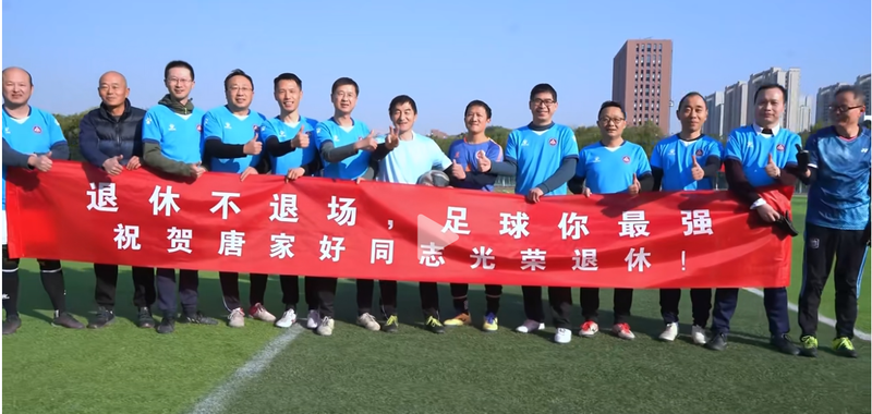 比赛开始前,足协会还为学校第一位在绿茵场上坚持到退休的唐家好同志打出了“退休不退场、足球你最强”的横幅表示祝贺。