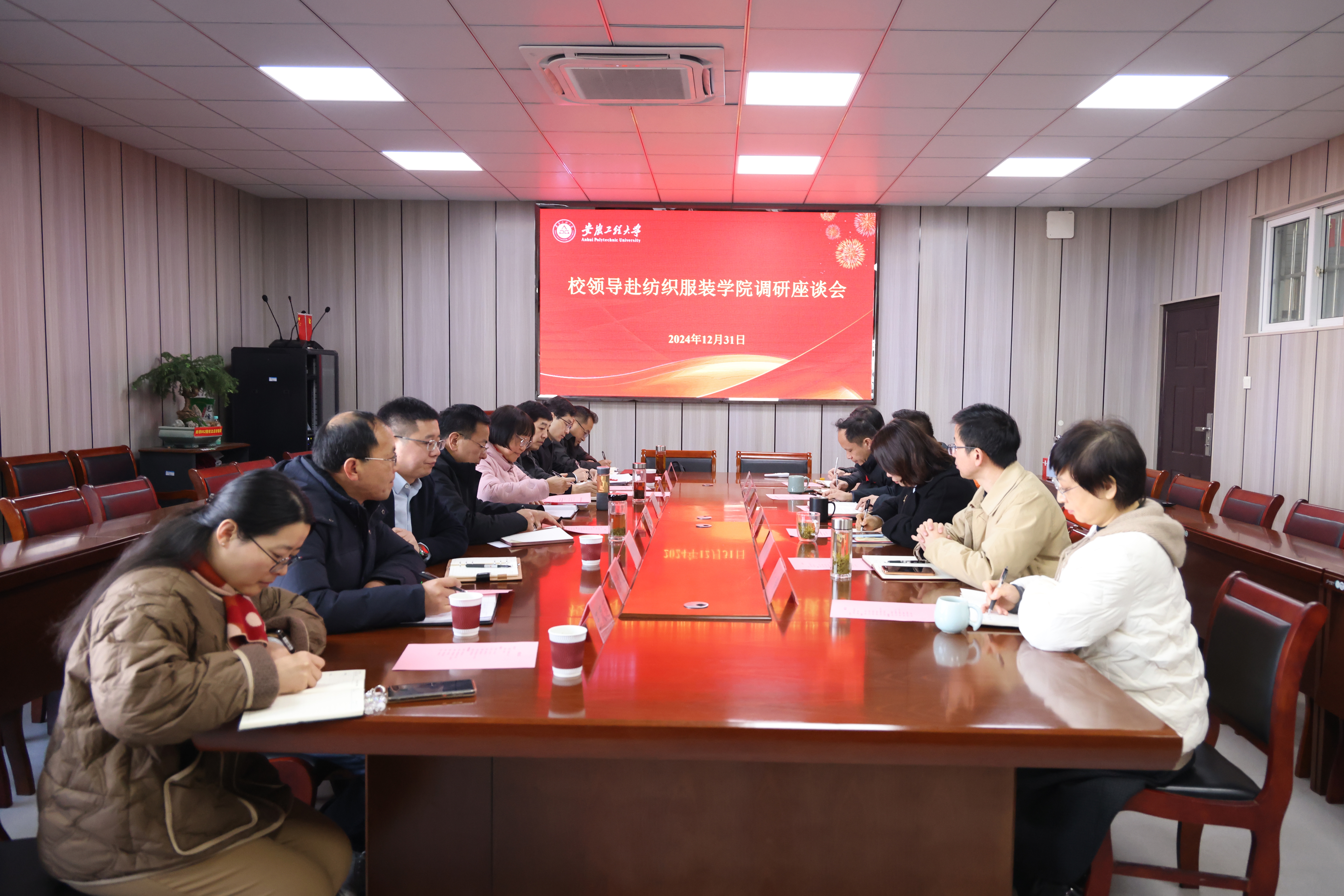 本网讯12月31日,校党委副书记、校长黄友锐,副校长周虹屏带队赴纺织服装学院调研指导工作,办公室、人事处、国资处、教务处、研究生部(学科办)、科技处相关负责人陪同调研。纺织服装学院党政领导班子成员参加调研会。