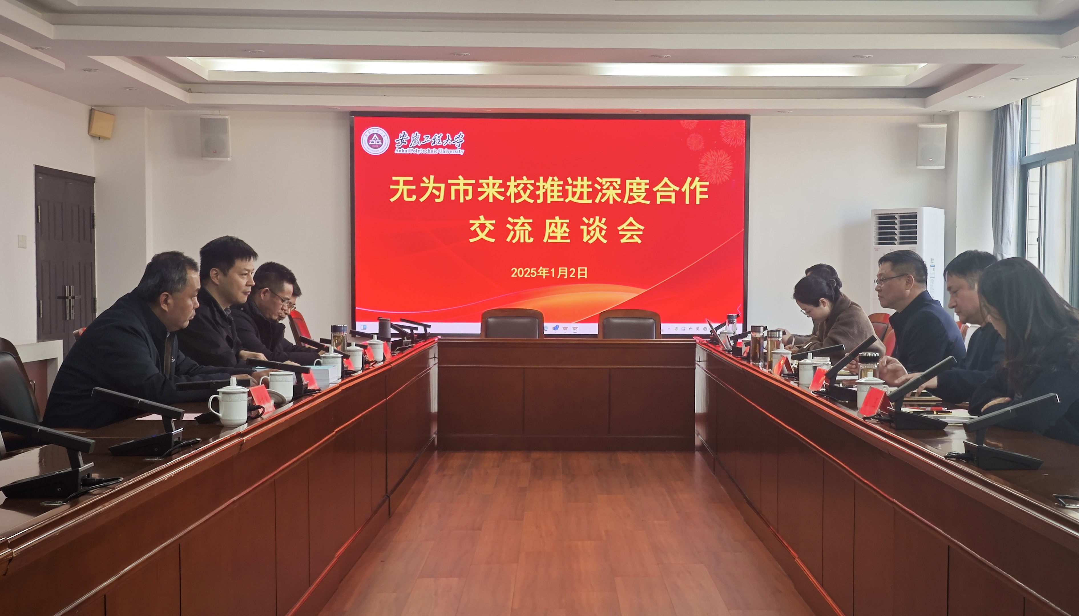 本网讯 1月2日,无为市委常委、组织部部长陈兆强,无为市工信局局长潘敬生,总经济师陈薇,无为市产业投资有限公司副总经理、芜湖市绿色食品产业研究院有限公司董事长宣玉,芜湖市绿色食品产业研究院有限公司总经理张国强等一行来校开展深度合作交流。校党委常委、副校长凤权会见陈兆强一行,校资产经营公司、科技处、社会合作处、生物与食品工程学院等部门负责人参加座谈会。