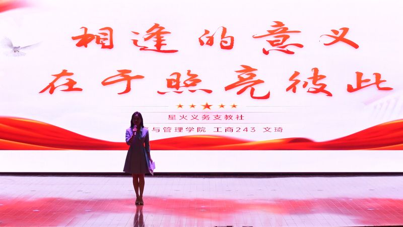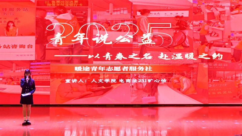 人文学院旷心怡、经济与管理学院文琦同学讲述“青年说公益”青春思政课,用鲜活故事讲述暖途青年志愿者服务社、星火义务支教社的志愿服务故事。