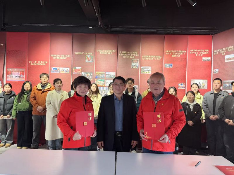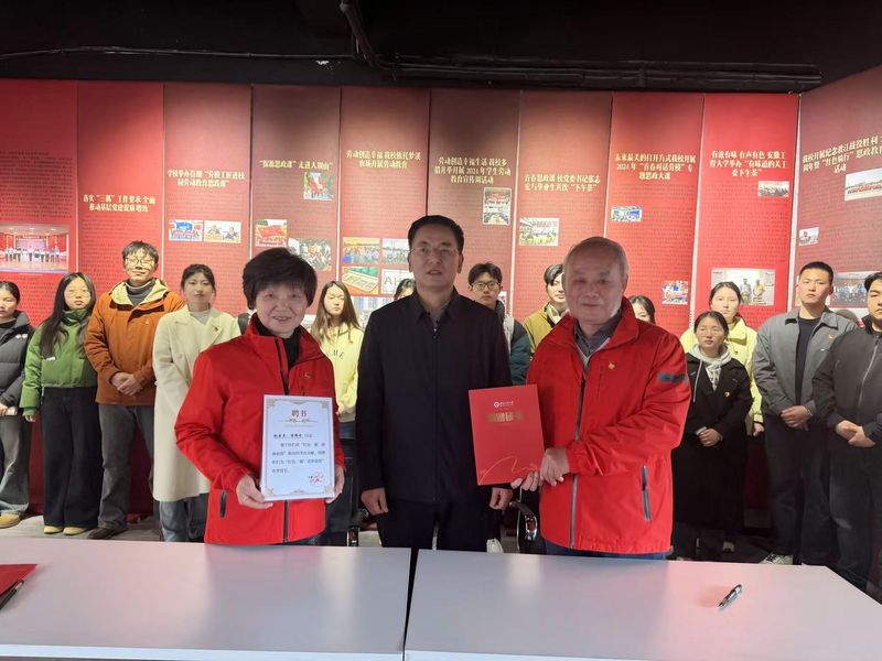 黄友锐代表学校与红色骑行工作室负责人赵国庆、曹锦芬签订捐赠协议,向两位老师颁发捐赠证书和红色“骑”迹体验馆名誉馆长聘书。王成军向两位老师颁发了学生辅导员聘书。