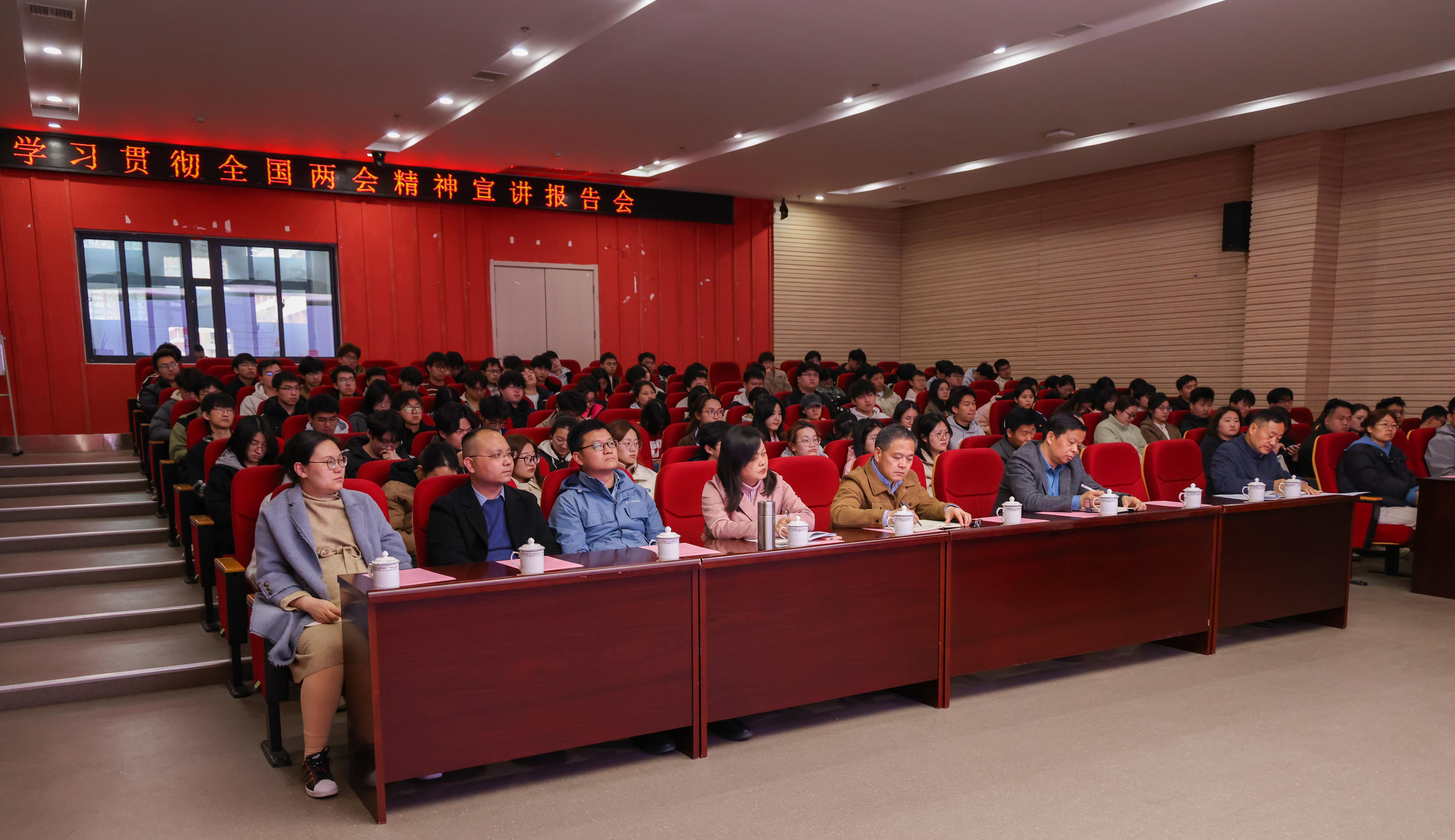 孙浩然在主持会议时指出,本次报告会是我们学习贯彻2025年全国两会精神的专题报告会,也是机械与汽车工程学院党委、电气工程学院(集成电路学院)党委、人工智能学院党委理论学习中心组的联学会,更是面向大学生的一堂生动的“大思政课”。他要求,要坚定理想信念,深入学习贯彻习近平新时代中国特色社会主义思想,把个人理想追求融入民族复兴伟大征程,努力成长为国家急需的创新人才;要从学习全国两会精神中汲取精神力量,在全面建设社会主义现代化国家的火热实践中汇聚青年力量,展现当代青年担当;要在全面学习、全面把握、全面落实上下功夫,切实做到学用结合、知行合一推动学校高质量发展。