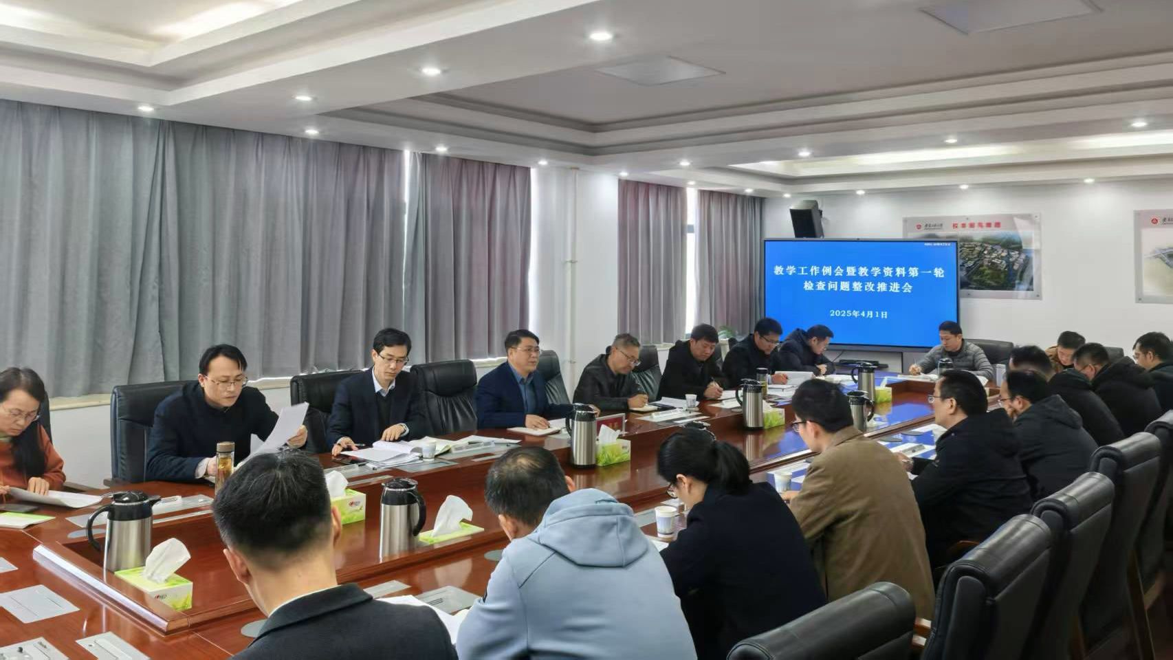 本网讯 4月1日,学校在A座1213会议室组织召开审核评估自评自建教学资料第一轮检查问题整改推进会。各学院分管教学院长,学生处和现代技术中心负责人,教务处科以上人员参会。会议由副校长王成军主持。