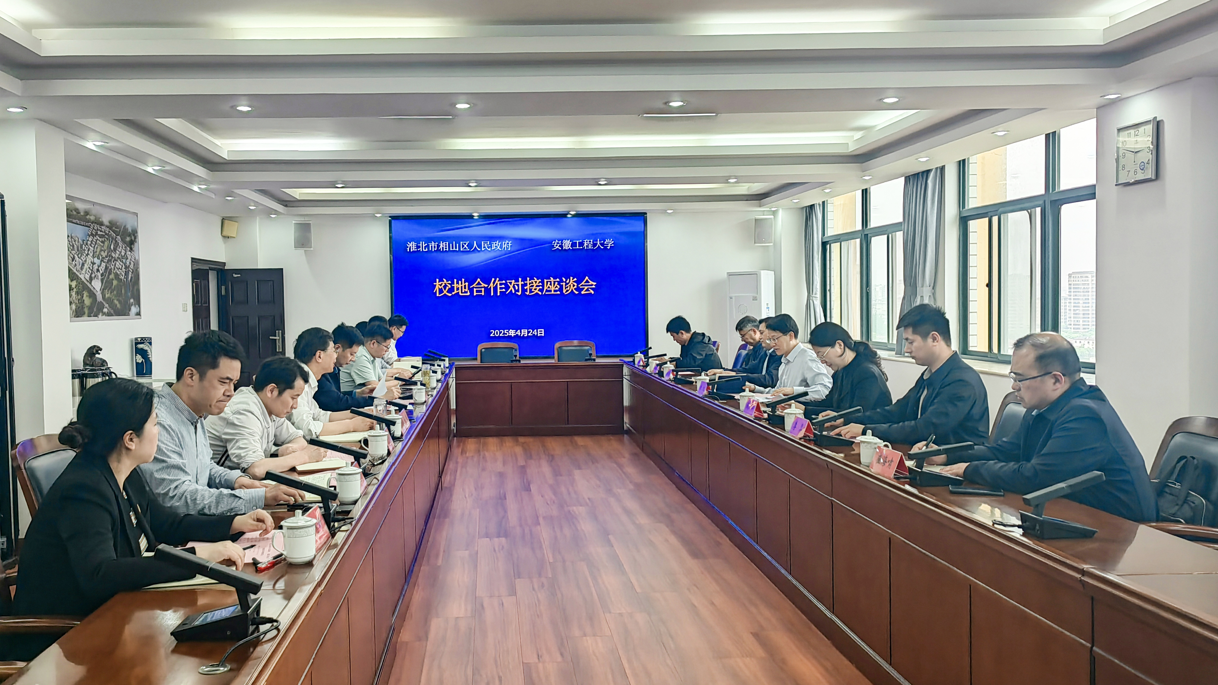 本网讯 4月24日,淮北市相山区委书记朱龙率队来校推进校地合作工作,在A座1215会议室召开座谈会。会前,校党委书记卢平,校党委副书记、校长黄友锐会见了朱龙一行。校党委常委、副校长凤权,党委常委、组织部长林煦东出席会议。相山区和我校相关部门负责人参加会议。