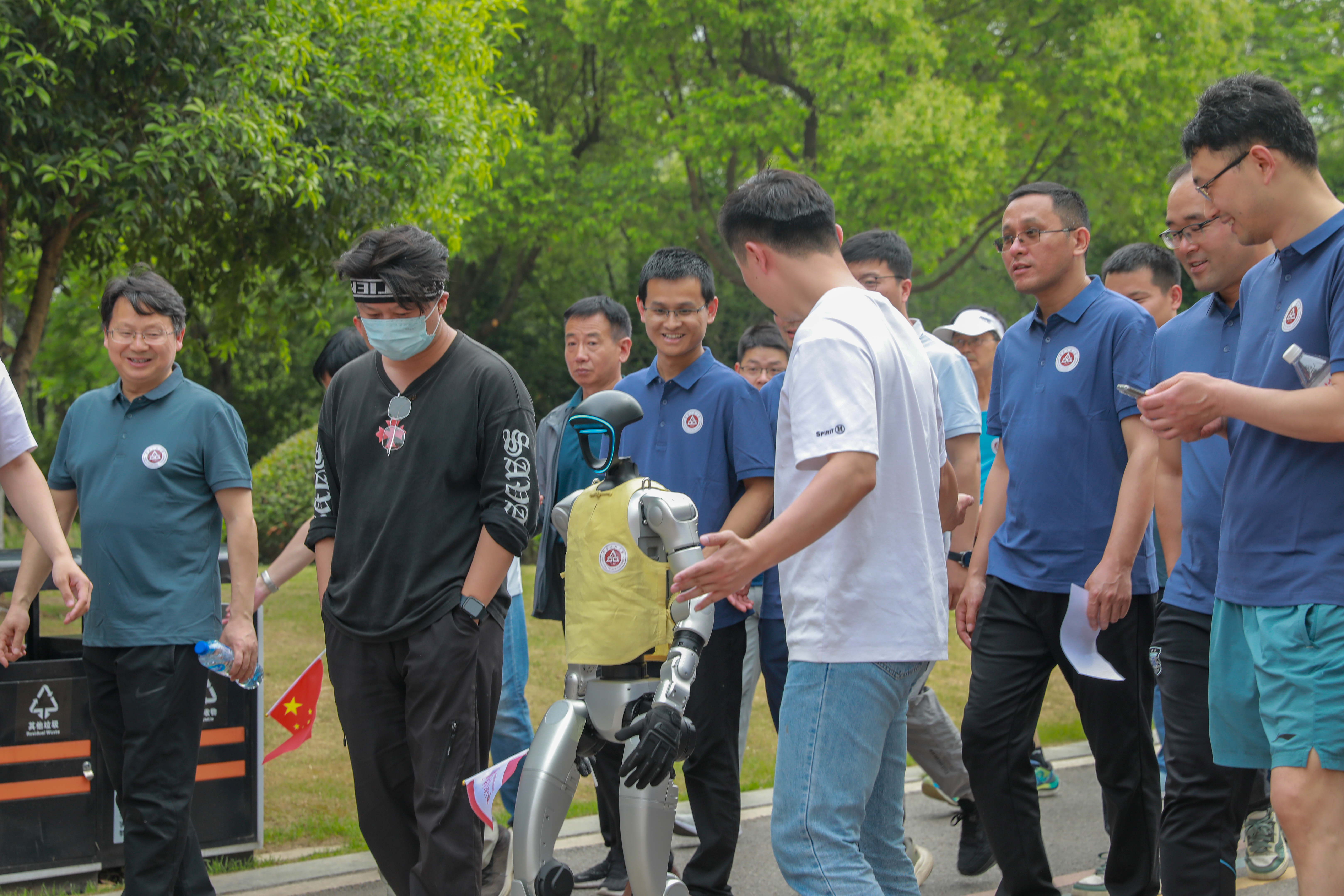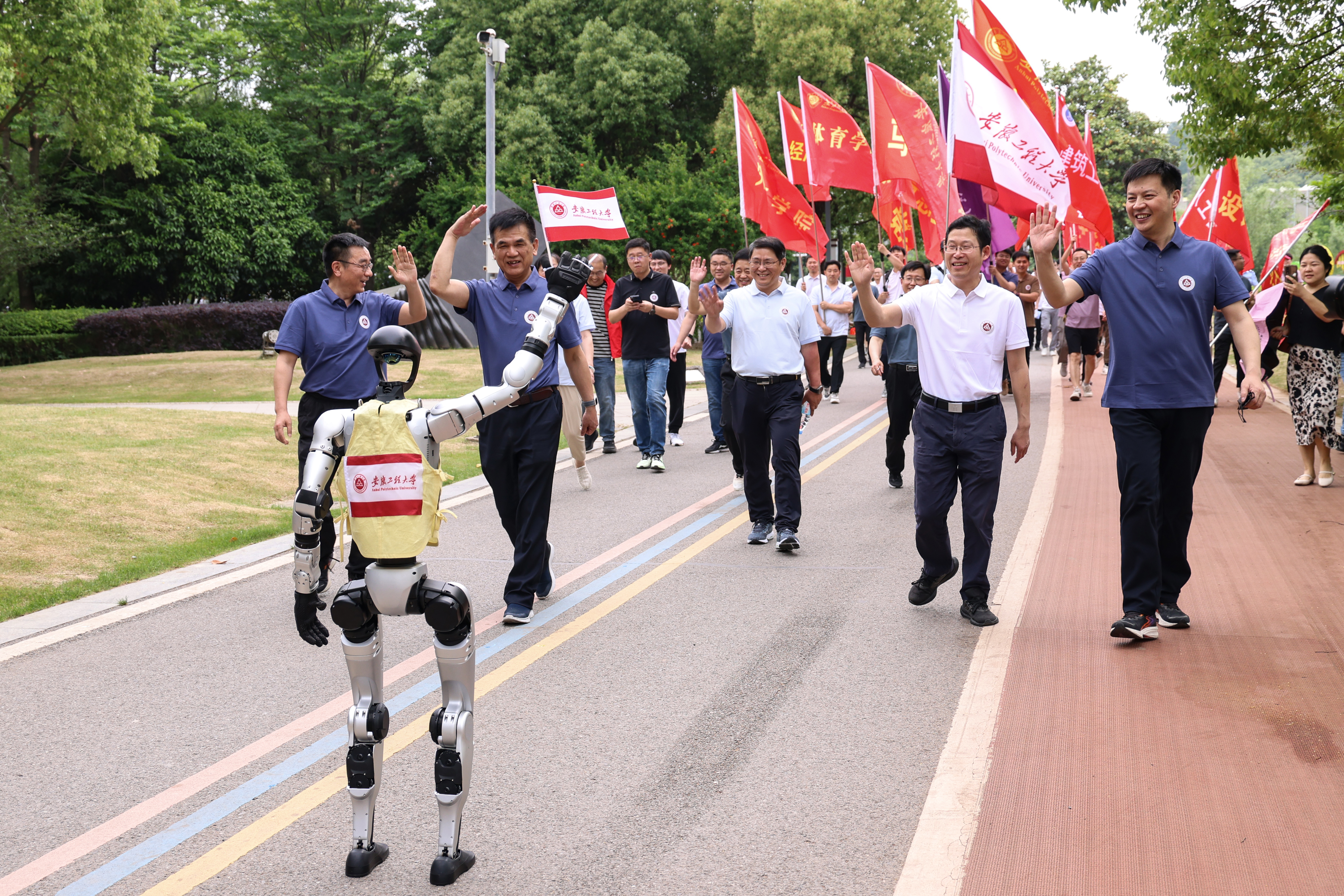 智能机器人“安小智”加入徒步走队伍后,迅速成为全场焦点,大家纷纷举起手机记录这一场景。人工智能学院方明老师介绍道:“‘安小智’是我校人形机器人研究所与启智机器人基于智能机器人通用技术底座平台,联合开发人形机器人行走算法训练框架,实现了人形机器人稳定行走。”纺织服装学院为“安小智”设计了服装,以芜湖本地黄檗树皮进行染色,明亮的黄色尽显活力,运动感十足。款式上借鉴了中式传统侧开马甲风格,结合一字盘扣,将传统与科技完美融合。