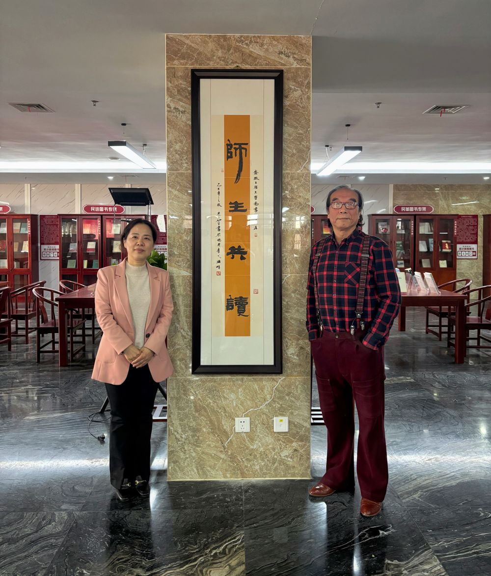 本网讯 11月13日,中国楹联学会书画艺术委员会委员,安徽省书法家协会第三、四届理事,芜湖市书法家协会名誉主席,书法篆刻名家朱石金先生向我校图书馆捐赠书法作品“师生共读”。学校图书馆馆长李琛作为代表接受捐赠。