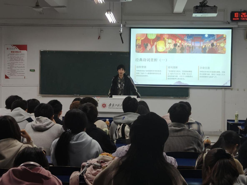 本网讯 为传承红色基因,弘扬中华优秀传统文化,11月18日,由校大学生社团管理中心主办、建筑工程学院子衿诗社承办的“冬日诗韵·家国情深”主题团日活动在5J101教室温情启幕。40余名诗社成员齐聚一堂,以“诗词速配”破冰互动点燃现场。