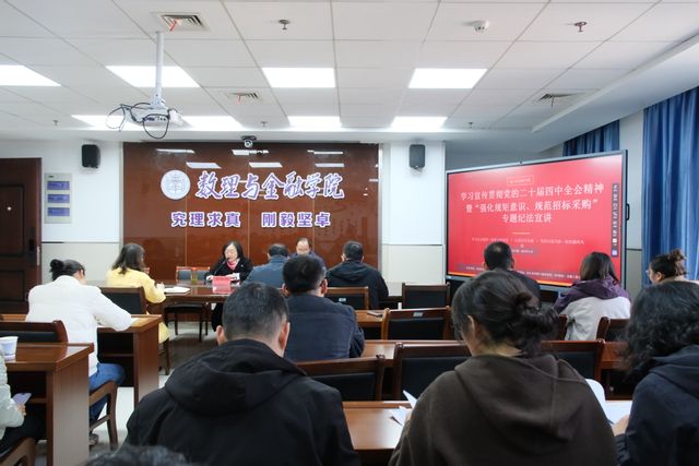 本网讯 为深入学习宣传贯彻党的二十届四中全会精神,扎实推进全面从严治党,切实筑牢风险防控屏障,11月26日,副校长周虹屏赴数理与金融学院开展“学习贯彻党的二十届四中全会精神暨‘强化规矩意识、规范招标采购’”专题纪法宣讲。校国资处负责人、数理与金融学院全体教职工参加会议。