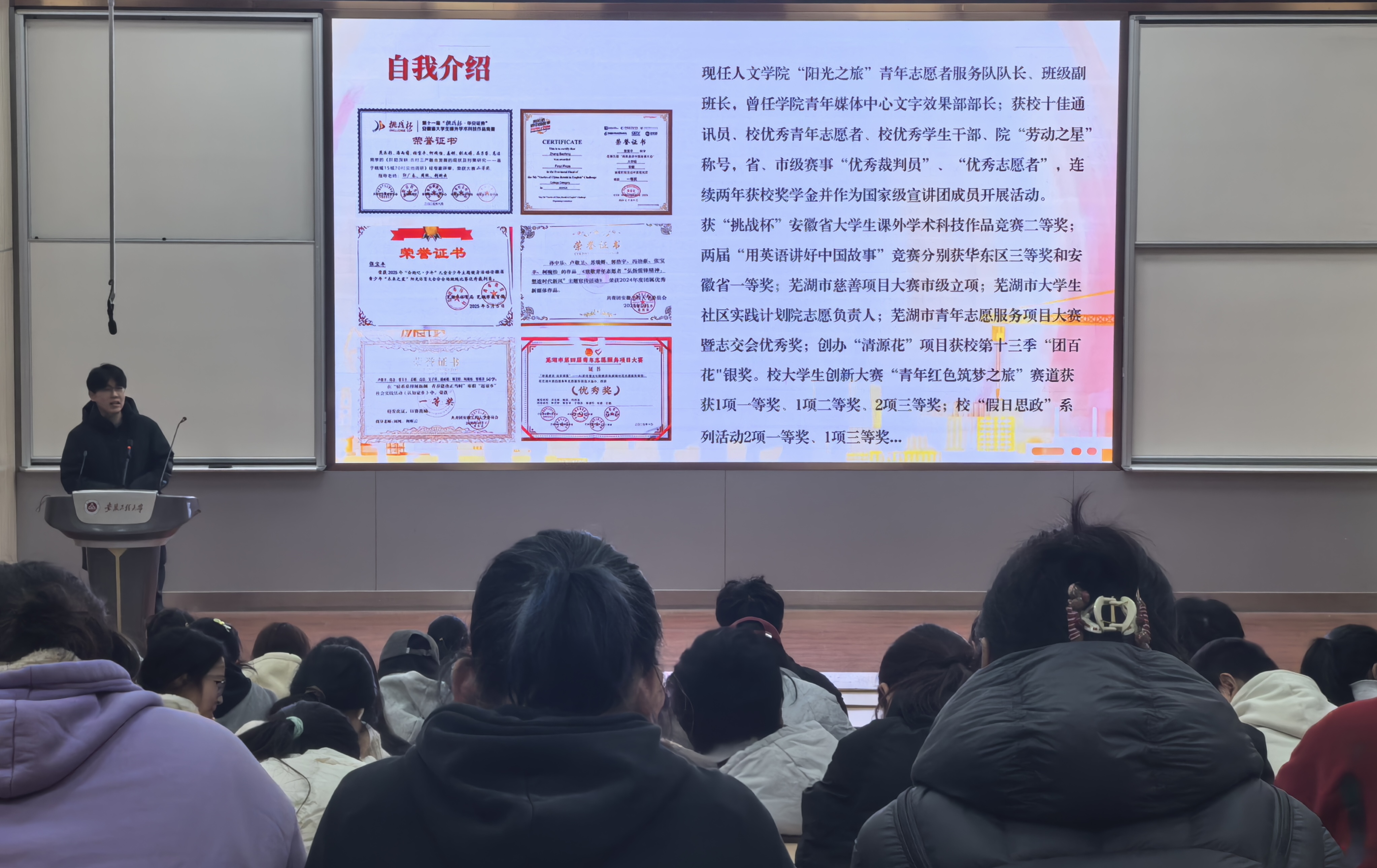 本网讯 11月26日,学校在2J报告厅举办“科创引领成长,青春筑梦未来”主题交流活动。活动邀请第十九届“挑战杯”全国大学生课外学术科技作品竞赛国家二等奖获得者纺织服装学院研23陈缘和人文学院“阳光之旅”青年志愿者服务队队长法学232班张宝丰主讲,各学院青马班学员共计200余人参加活动。