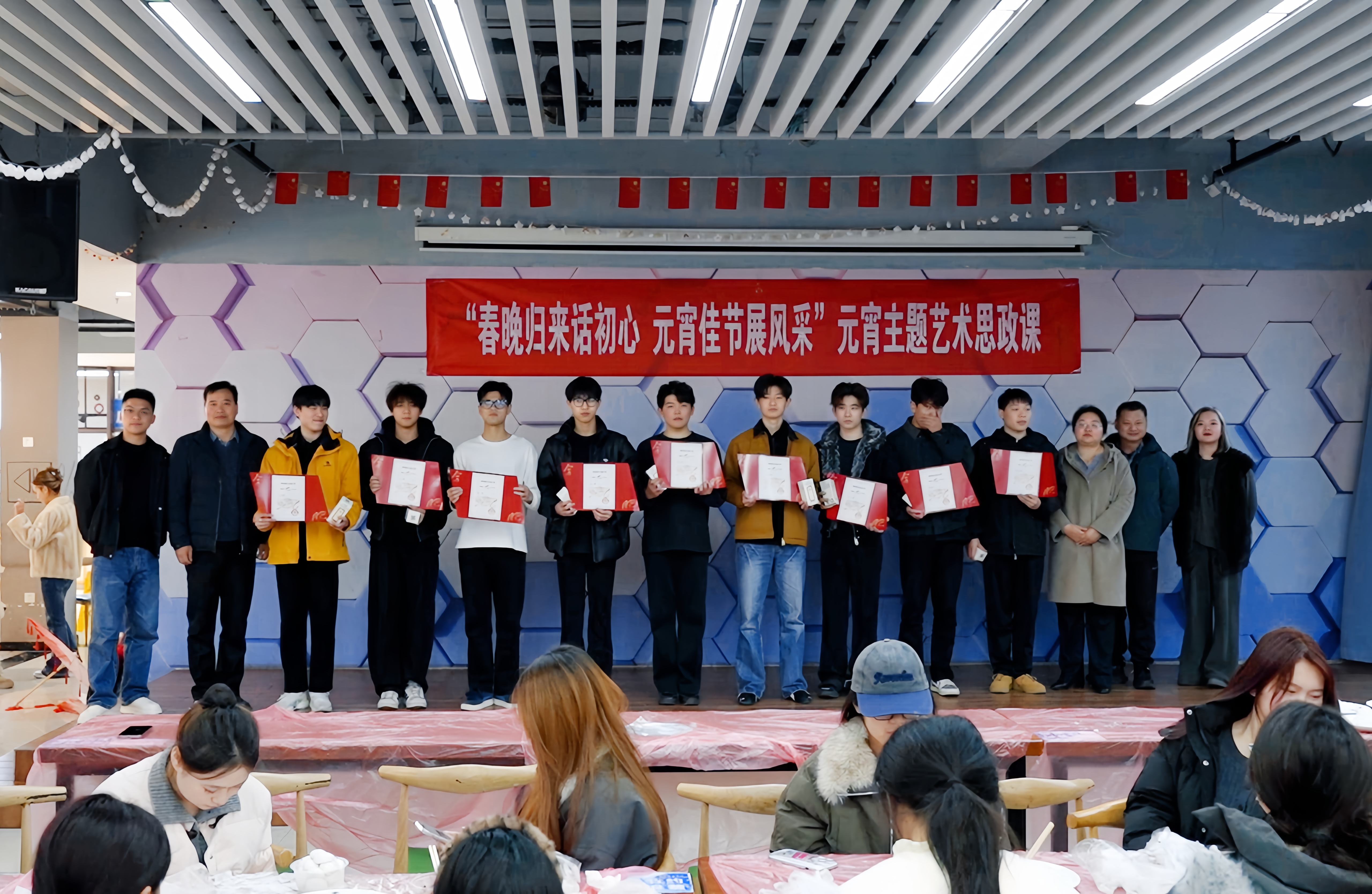 本网讯 为弘扬中华优秀传统文化,发挥实践育人实效,3月3日下午,体育学院在学生社区第五食堂二楼艺术角举办“春晚归来话初心 元宵佳节展风采”主题艺术思政课。体育学院院长胡好、党总支副书记马晓琼、副院长金庆红参加活动,与参演央视春晚的学子及师生代表共度佳节。