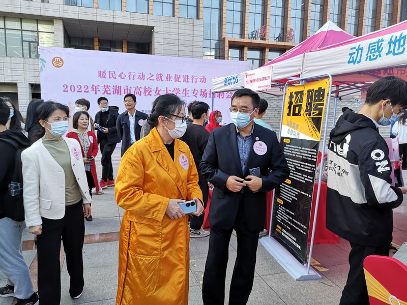 11月2日下午,我校首场女大学生专场招聘会暨皖南地区城市组团双选会在校图书馆广场如期举办,来自芜湖、马鞍山、黄山、池州、宁国等地共105家企业入校选聘人才,其中31家企业是芜湖市妇联与校就业指导中心联合举办的针对女大学生的专场。岗位需求涉及机械、电气、计算机、生物化学、管理、艺术、外语等多个专业,吸引了近千名毕业生到现场参加应聘。校党委常委、副校长郑健,市妇联党组书记、主席蒋晓华等来到招聘会现场,看望企业招聘人员和参会大学生,并与他们亲切交流。招聘会现场,人头攒动,应聘者纷纷向意向企业投递简历,了解情况,气氛热烈,女大生专场更是吸引了众多女大学生的青睐,她们纷纷表示,要抓住机会,多了解几家企业,多投几份简历,就多几分机会。各地人社部门纷纷对学校在全国疫情多点爆发情况下组织此次招聘会表示感谢,各参会企业也都表示收获满满。招聘会期间,我校职能部门还分别与黄山人市社局、马鞍山市人社局签订了人才合作协议,举办了人才工作站授牌仪式。此次招聘会是党的二十大胜利召开之后,学校举办的首次大规模线下招聘会,为做好疫情防控工作,学校前期进行了周密的组织策划,并与各地人社部门保持了密切的沟通,对入校179名