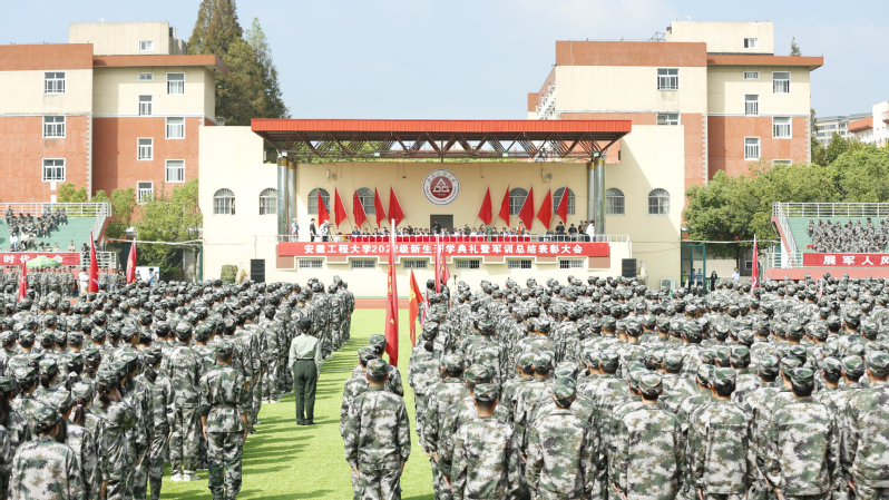 本网讯 9月16日,我校2022级新生开学典礼暨军训总结表彰大会在第一田径场举行。校领导张志宏、王绍武、苏国红、郑健、程双四出席。鸠江区人武部部长刘忠波,杰出校友、上海景泰建设股份有限公司董事长李明祥应邀参加。校党委常委、副校长郑健主持大会。伴随着庄严的国歌声,五星红旗在国旗班的护卫下冉冉升起,开学典礼正式拉开帷幕。军训方阵迈着整齐的步伐依次通过主席台接受检阅,他们身姿挺拔、军容严整,动作整齐划一、口号响彻云霄。国旗班和4个连代表军训团展示了队列训练成果,4个团的特色排分别给我们带来了匕首操、刺杀操、擒敌拳、战术演练的精彩表演。校党委书记张志宏代表学校向芜湖市鸠江区人武部赠送锦旗。校党委副书记苏国红宣读2022级新生军训先进集体和先进个人的表彰决定,对37个军训先进连和592名军训先进个人给予表彰。校党委副书记、校长王绍武致辞,他代表学校向2022级全体本科生和研究生表示欢迎、向芜湖市鸠江区人武部和承接军训任务的教官同学表示由衷的感谢,并从办学历史和学科专业等方面简单介绍了学校情况。他指出,同学们应谨记习近平总书记在中国人民大学考察时,对青年们的寄语:要牢记党的教诲,立志民族复兴,不负