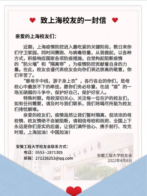 近期新冠病毒奥密克戎变异株引发的疫情突袭申城,上海人民面临着疫情常态化防控以来最严峻的考验。申城人民在风雨中鏖战坚守,守望相助,全国各地驰援上海,共同守“沪”。同样,上海的疫情牵动着我校师生的心。学校校友会对我校在上海的校友更是生相思,两处焦愁,致《上海校友一封信》表达了母校对以各种方式战“疫”的校友深切的关怀与关注,此刻,母校是他们在困难时期的坚强后盾,家信带去问候与之同心同力抗疫之力。上海校友在收到母校的慰问信后,感受到母校给与的力量及血浓于水的母校情。他们坚信,母校与他们同在,始终是他们最坚强的后盾。情海纳百川、追求卓越、开明睿智、大气谦和”的上海人民,大力践行伟大抗疫精神,一定会早日斩除疫魔,重归和乐。