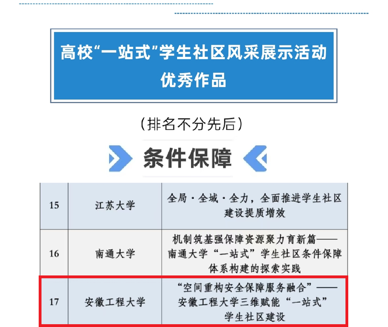 三维赋能“一站式”学生社区建设》成功入选“条件保障”板块优秀成果。近年来,学校始终以学生成长为中心,积极推进“一站式”学生社区建设,已建成“2+2+N”“一站式”学生社区综合管理模式。学校持续强化条件保障,提出“场景即教育、安全即成长”的建设理念,通过空间场景化重构、安全教育沉浸化体验、服务育人生态化融合三维赋能,打造“可感知、可参与、可成才”的“一站式”学生社区。此次获评优秀成果是对我校“一站式”学生社区建设工作的充分肯定。学校将以此为契机,深入落实《高校“一站式”学生社区综合管理模式建设提质增效指南》要求,坚持党建引领、队伍入驻、学生参与、文化建设、数字赋能和条件保障“六位一体”推进,进一步推动学校“一站式”学生社区高质量内涵式发展。(文/图:顾安骏;编辑:赵静云;预审:杜松涛;审核:黄炜)