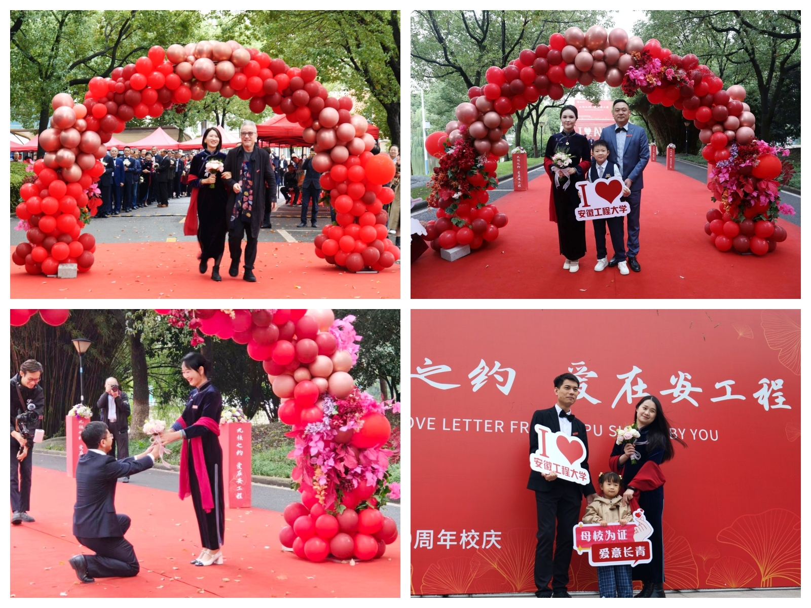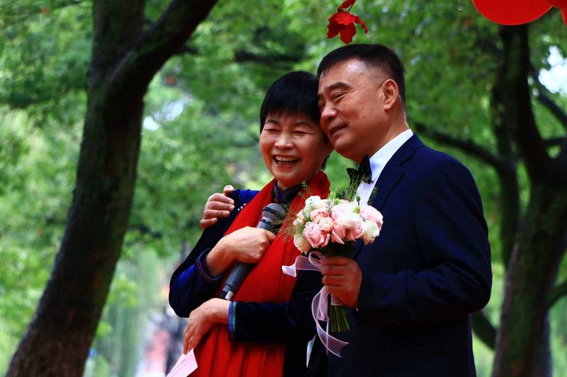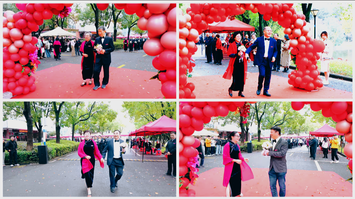 红毯铺展,鲜花簇拥。90对校友伉俪身着定制旗袍礼服款款而行,女士的旗袍雅致温婉,红纱轻扬;男士的白衬衫搭配黑西裤,风度翩翩。他们携手走过红毯,献花合影,每一步都仿佛踏在岁月的琴弦上,奏响着相守数载的深情乐章。校友伉俪代表蔡兴贵、程冬梅夫妇分享了他们40余年来的校园爱情与携手创业的故事,真挚的情感打动了在场每一个人;老教师代表余新霞老师深情回顾了教书育人的岁月,讲述着对学子们的殷切期许与牵挂。