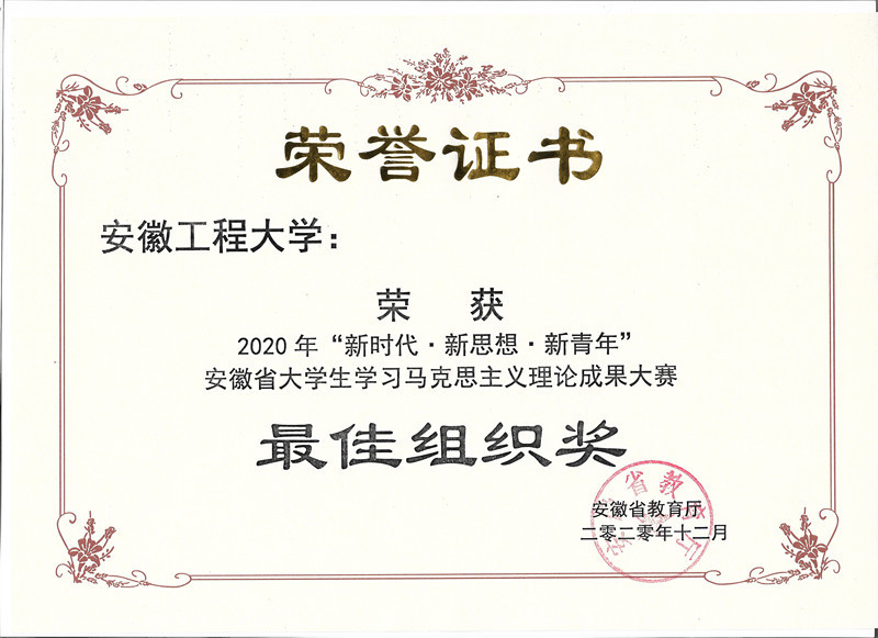 本网讯近日,安徽省教育厅公布2020年“新时代•新思想•新青年”安徽省大学生学习马克思主义理论成果大赛评审结果,全省共计43所高校153件作品参赛。我校选送5件作品4件获奖,其中一等奖1项、二等奖3项,学校再次获得最佳组织奖。