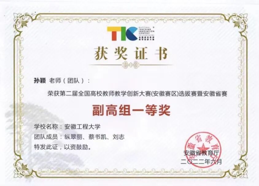 操雅琴老师在全国高校经管类实验教学案例大赛荣获三等奖;孙颖老师在第二届安徽省高校教师教学创新大赛中荣获一等奖;唐娟、张孝琪两位老师在学校2022年教师教学创新大赛中分别荣获二等奖、吴锋老师荣获三等奖,其中张孝琪老师将代表学校参加2023年全省教学创新大赛;沈超老师在学校第五届“课程思政”说课大赛中荣获二等奖。学校首批五个“教学名师工作室”揭牌,我院孙颖和纵翠丽两位老师获得学校“首批教学名师”工作室立项;学院新增省级教学团队1个。