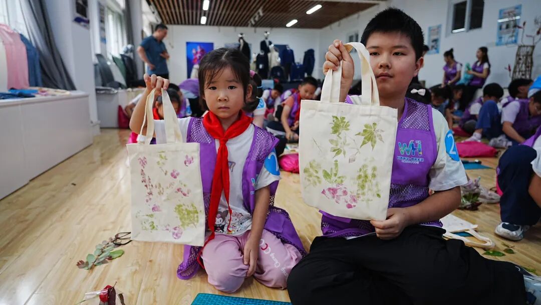 此外,孩子们还通过捶打花叶完成植物敲拓染创作,帆布包上的天然纹样凝聚着对非遗技艺的创新传承,通过“做中学”的模式,让传统文化真正活起来。