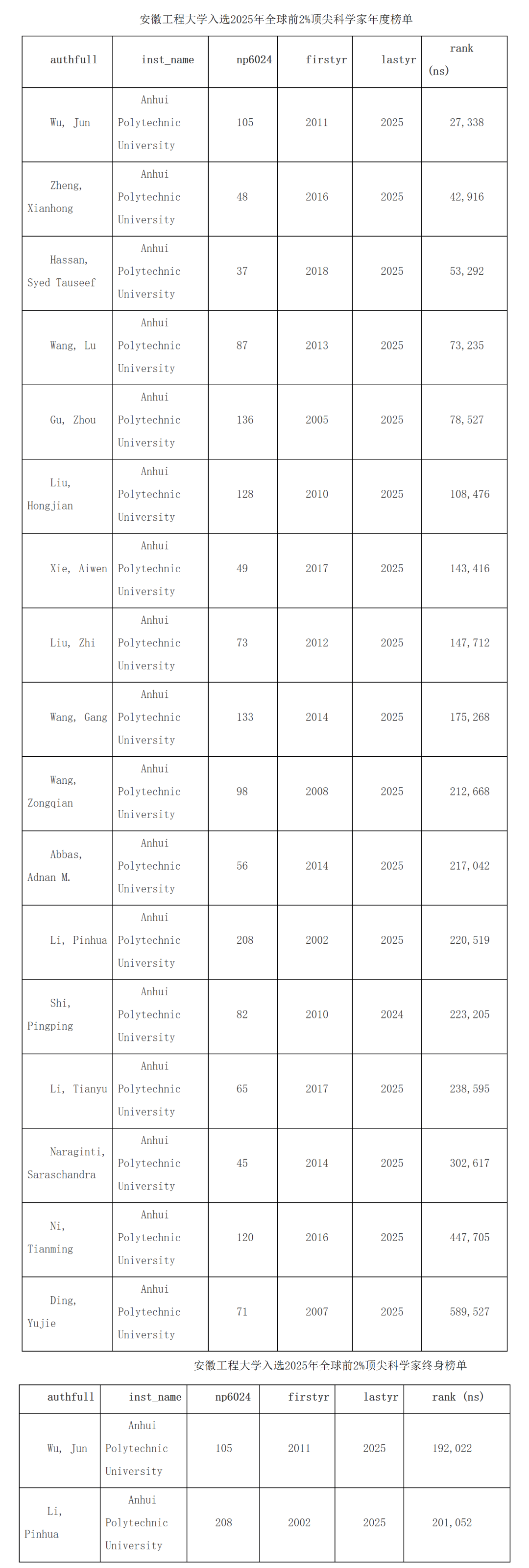 近日,斯坦福大学(Stanford University)和国际权威学术出版社爱思唯尔(Elsevier)共同发布2025年全球前2%顶尖科学家榜单(World's Top 2% Scientists)。我校2名学者入选“全球前2%顶尖科学家生涯影响力排行榜”,17名学者入选“全球前2%顶尖科学家年度影响力榜单”,入选人数均高于往年,充分体现学校学者的学术水平,彰显了学校的科研实力和国际影响力。