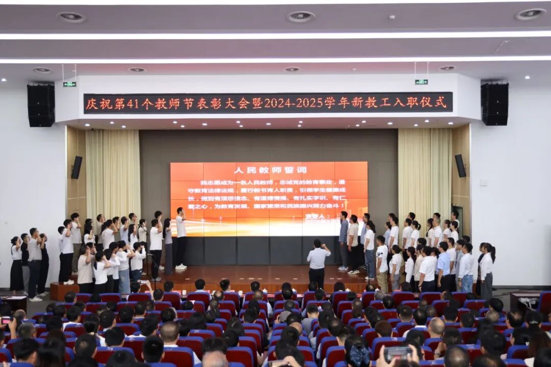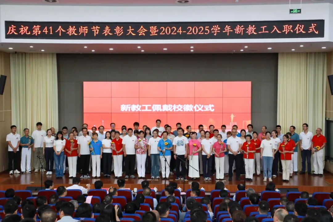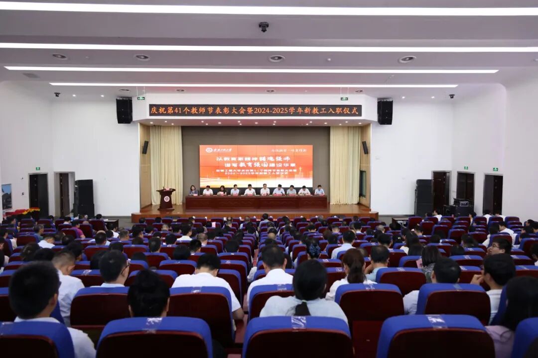 9月10日,学校在图书综合楼5楼会议室举行庆祝第41个教师节表彰大会暨新教工入职仪式。校领导卢平、郑健、程双四、凤权、周虹屏、张开炳、王成军出席。相关职能部门、各二级单位主要负责人,受表彰教职工,全体新进教职工,离退休老同志和师生代表共计400余人参加。