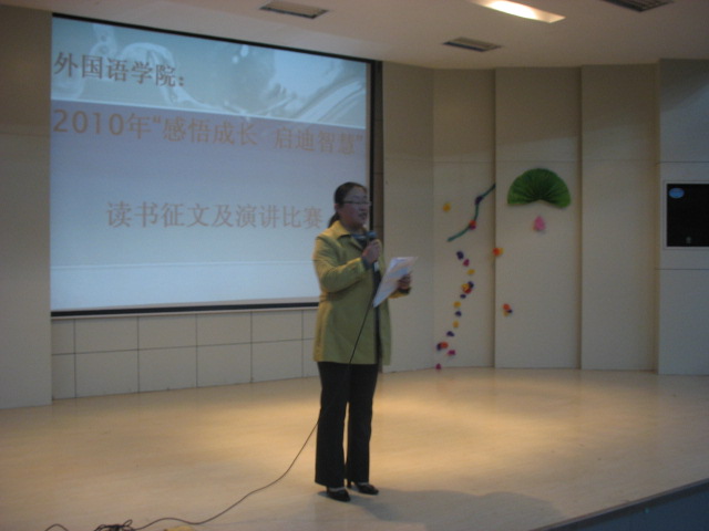出席此次比赛的有外语系党总支副书记谈丽华、团总支书记李烨及各辅导员,并特邀校图书馆副研究员章靖平作为点评嘉宾。比赛中,选手各展风采,或热情洋溢,描绘书香飘逸的书海;或妙语连珠,感悟读书旅途的雅趣;或字句铿锵,评析名著思想的深刻,精彩的演讲深深地感染了在场的每一位观众,不时博得一阵阵热烈的掌声。