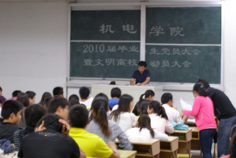 学生第一党支部书记高潮在讲话时要求大家,要树立“党员不仅仅是一种荣誉,更是一种责任”、“入党是一种奉献,更是一种牺牲”的理念,在毕业生离校的日子里,既要自觉发挥党员先锋模范作用,争做文明离校楷模,又要确保班级全体同学文明有序离校,把感激留给老师,把关心留给同学,把文明留给学校。